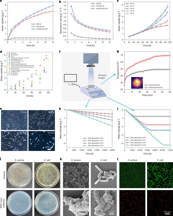 Fig. 2 Water adsorption, desorption, and antibacterial performance of SA/CB-PDA/LiCl aerogels. a, Dynamic water sorption process of SA/CB, SA/CB/LiCl, and SA/CB-PDA/LiCl aerogels with salt contents of 30% at 25 °C and 95% RH. b, Water absorption rate of SA/CB, SA/CB/LiCl, and SA/CB-PDA/LiCl aerogels with salt contents of 30% at 25 °C and 95% RH. c, Water absorption isotherms of SA/CB-PDA/LiCl aerogels at different temperatures. d, Comparison of the adsorption capacity at various RH of SA/CB-PDA/LiCl aerogels with those of several reported AWH materials. e, Optical images of the water droplets growth, coalescence, and migration in SA/CB-PDA/LiCl aerogels. Scale bar: 200 µm. Photograph of the SA/CB-PDA/LiCl aerogels. f, Schematic diagram of the setup for the water evaporation performance test. g, Time-temperature curves of SA-PDA@LiCl aerogel and SA/CB-PDA/LiCl aerogels at 24 °C and 70% RH under 1.0 Sun irradiation. h, i, The desorption processes of SA-PDA/LiCl and SA/CB-PDA/LiCl aerogels at 24 °C and 70% RH under 1.0 Sun irradiation. j, The images of bacterial colonies on the agar plates. k, SEM images of S. aureus and E. coli of co-culture with different hydrogels for 4 h. l, Confocal images of S. aureus and E. coli co-incubation with different hydrogels by using SYT09/PI fluorescent staining.