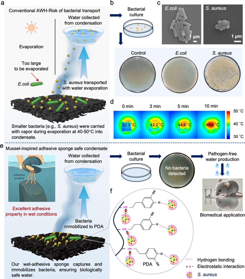 Fig.1 Comparative evaluation of conventional AWH and mussel-inspired PDA sponge for pathogen-free water harvesting. a, Schematic of bacterial transport during AWH. b, Pathogen assessment of AWH-collected water. c, SEM images of E. coli (left) and S. aureus (right). Scale bars, 1 µm. d, Thermal images of a conventional AWH sample following water uptake, illustrating a surface temperature rise from 32.3 °C to 48.9 °C over 10 min under one-sun irradiation. e, Schematic of the mussel-inspired PDA sponge capturing bacteria for pathogen-free water harvesting. f, Mechanism of bacterial capture by PDA-coated sponge under AWH conditions.