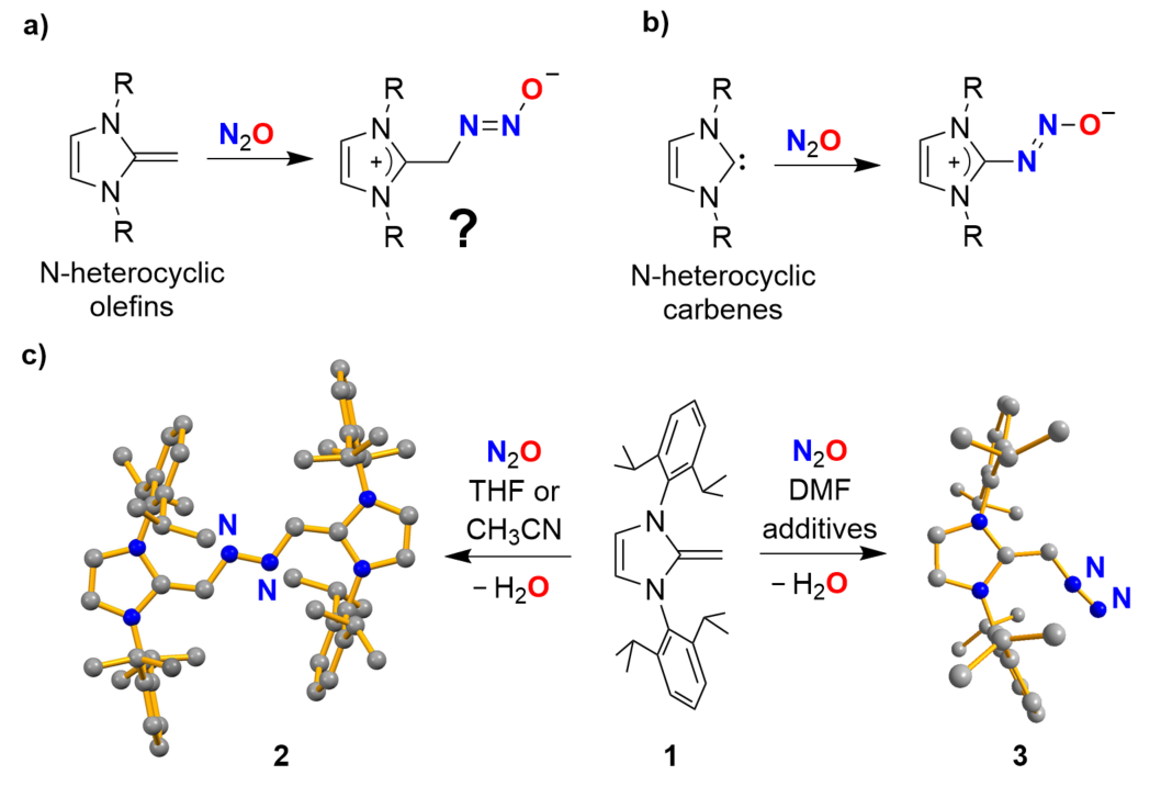 Figure 1. The reaction of N-heterocyclic olefins with N2O was expected to give diazotates (a), in analogy to what we had observed for N-heterocyclic carbenes (b). Instead, the reaction of 1 with N2O in THF or acetonitrile was found to give the azo-bridged dimer 2. In DMF in the presence of additives, diazoolefin 3 is formed as the main product.