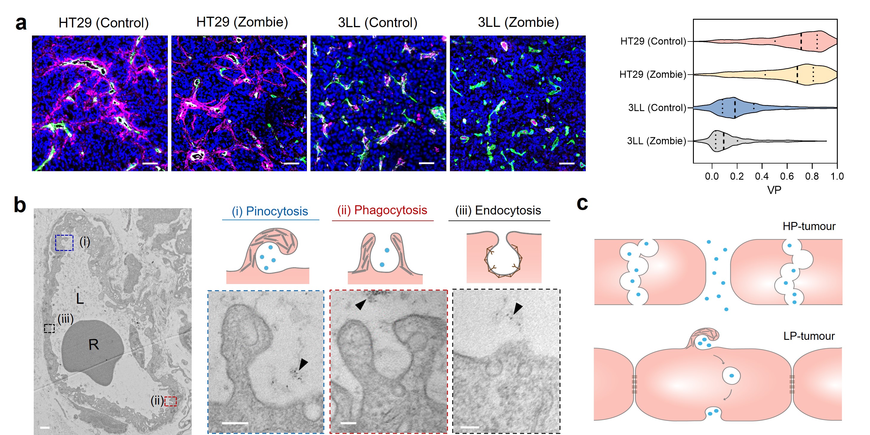 Furthermore, we used Zombie model (Figure 2a) and TEM images (Figure 2b) to investigate the penetration mechanism of FTn by assessing the extent of the contribution of passive extravasation (EPR effect) and active trans-endothelial transport (transcytosis) in different types of tumours. The results implied that FTn penetration in high permeable (HP)-tumours was mainly dependent on passive extravasation via inter-endothelial gaps and vesiculo-vacuolar organelle (VVO), whereas active trans-endothelial transport, mainly by pinocytosis, played a leading role in low permeable (LP)-tumours (Figure 2c).