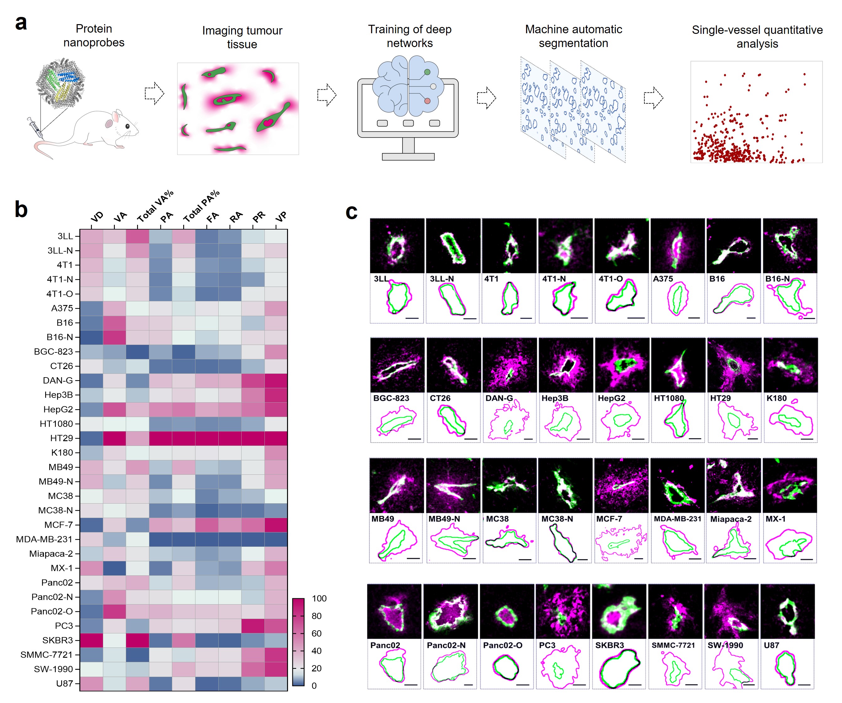 We chose genetically recombinant human ferritin nanocages (FTn) as model nanoparticles due to its homogenous size. As shown in Figure 1a, after i.v. administrated into tumour-bearing mice, the vascular permeability of Cy5-labelled FTn in individual vessels was analyzed by machine learning (ML) based-image segmentation, which may provide a potent manipulation to illustrate the heterogeneity of vascular permeability. Using the Nano-ISML, we first extracted four features from the images, the total FTn coverage area for each vessel (Amagenta), the coverage area of each vessel (Agreen), the total Cy5 fluorescence intensity for each vessel (Fmagenta), and the Cy5 fluorescence intensity in each vessel lumen (Imagenta). Based on the four features, nine indices were defined for single-vessel quantitative analysis. After analyzing over 67,000 individual vessels from 32 types of tumour models, the nine indices were normalized and displayed as heatmap, and the results demonstrated that the blood vessel permeability across different tumour model types was highly heterogeneous, and the highest vessel FTn penetration area ratio (PR) was over 100-fold greater than the lowest vessel PR (Figure 1b). The representative individual vessels and their corresponding FTn penetration are shown in Figure 1c.