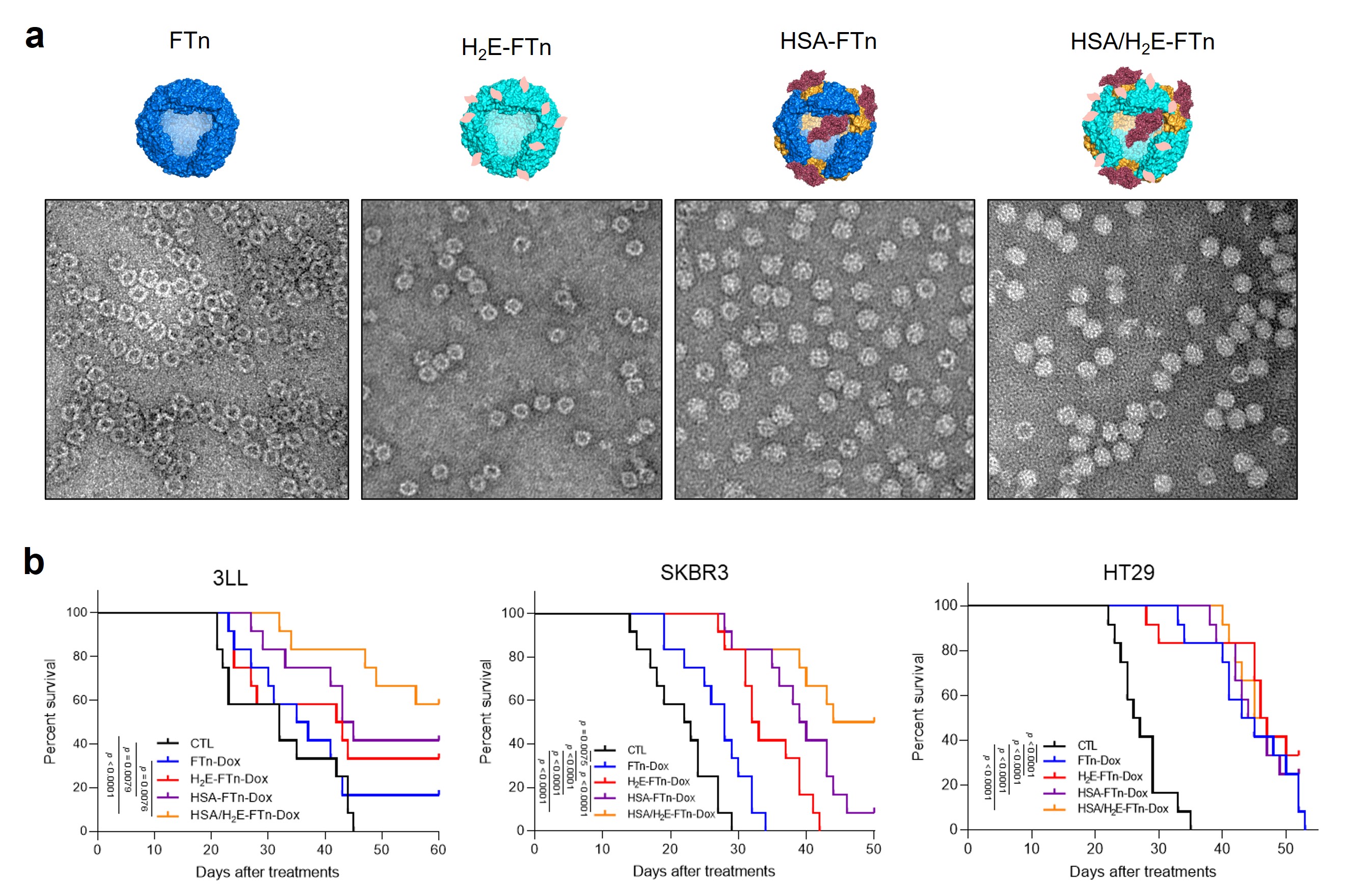 Furthermore, to improve the drug delivery efficacy of FTn in LP-tumours by modulation the vascular permeability, we genetically modified FTn to improve active trans-endothelial transport by reducing its lysosome trapping. An endosomolytic (H2E)9 peptide fused FTn, and human serum albumin (HSA) bound FTn were genetically engineered (Figure 3a). Then, the vascular permeability of FTn and its variants was quantitatively evaluated in HP-tumours and LP-tumours using the Nano-ISML. The vascular permeability of FTn variants was significantly improved in LP-tumours, but not in HP-tumours. Finally, the in vivo anti-tumour efficacy was evaluated by loading a chemotherapeutic drug, doxorubicin (Dox), into the cavity of FTn and its variants. As expected, the FTn variants showed a synergistic therapeutic action in LP-tumours (Figure 3b). These results revealed that improving vascular permeability of nanoparticles in LP-tumours correlated with the therapeutic outcomes.