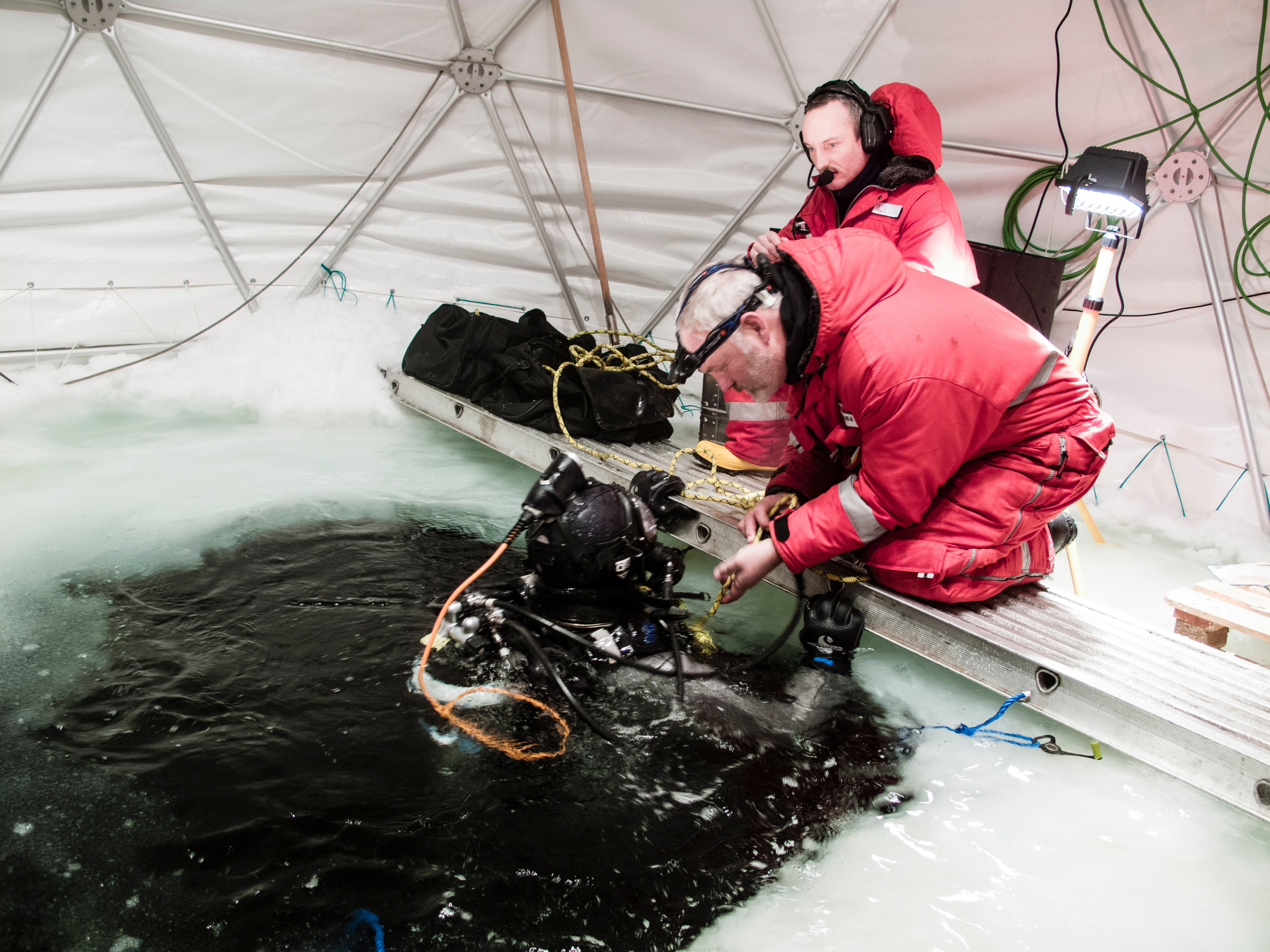 The dive team operated from rubber boats (Fig. 5) and ice camps (Fig. 6) and observed the behaviour of krill larvae over several days and up to two weeks day and night (Fig. 7). On the ice floe, the dive team used a “Dome tent” as a protection from the harsh weather conditions with strong winds and subzero temperatures (Fig. 3, left, Fig. 6). The dive operations were complemented with under ice observations using a Remotely Operated Vehicle (ROV, Fig. 8), equipped with different up-ward looking optical devices and sensors to investigate the spatial distribution of algal biomass within the sea ice3.