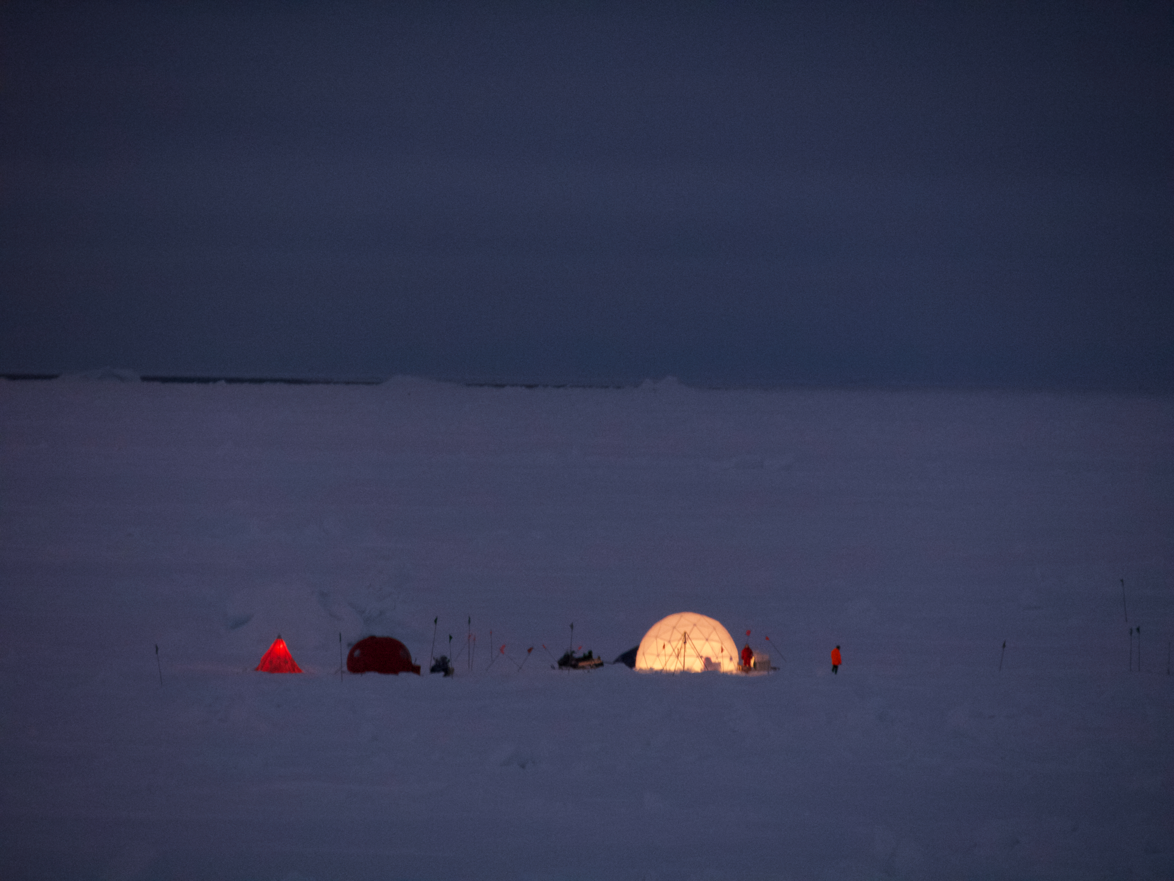 The dive team operated from rubber boats (Fig. 5) and ice camps (Fig. 6) and observed the behaviour of krill larvae over several days and up to two weeks day and night (Fig. 7). On the ice floe, the dive team used a “Dome tent” as a protection from the harsh weather conditions with strong winds and subzero temperatures (Fig. 3, left, Fig. 6). The dive operations were complemented with under ice observations using a Remotely Operated Vehicle (ROV, Fig. 8), equipped with different up-ward looking optical devices and sensors to investigate the spatial distribution of algal biomass within the sea ice3.