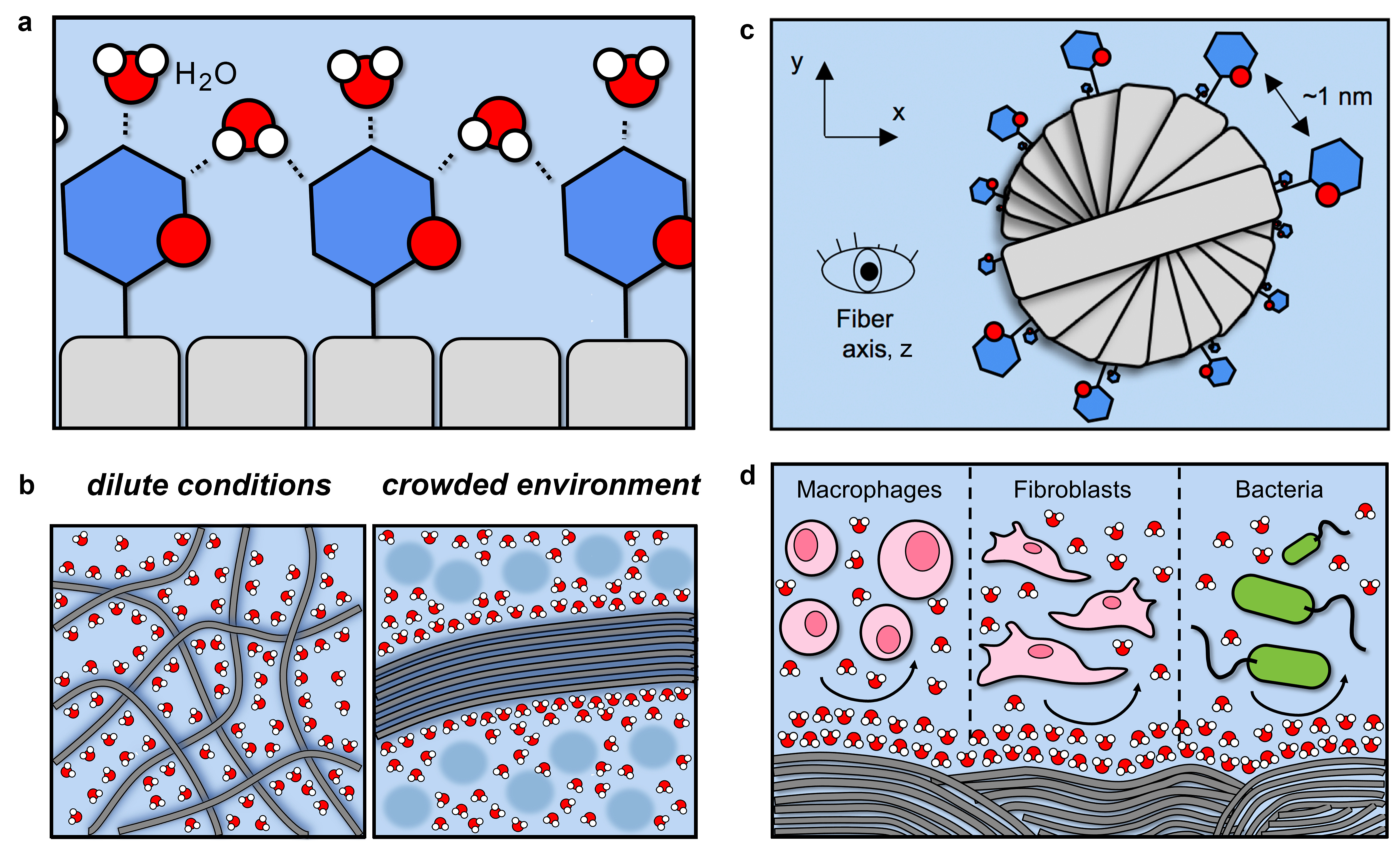Figure 1. Overview of hierarchical self-assembly and emergent function of densely glycosylated peptide nanofibers. (a-b) Carbohydrate-water interactions prevent nanofiber aggregation under dilute conditions, while excluded volume effects drive nanofiber bundling in crowded environments. (c) Carbohydrates radially projected at regular intervals provide inter-fiber contact points in all directions that facilitate lateral association without geometric constraint. (d) Glycans on the surface of nanofibrillar biomaterials prevent non-specific mammalian cell and bacteria adhesion.