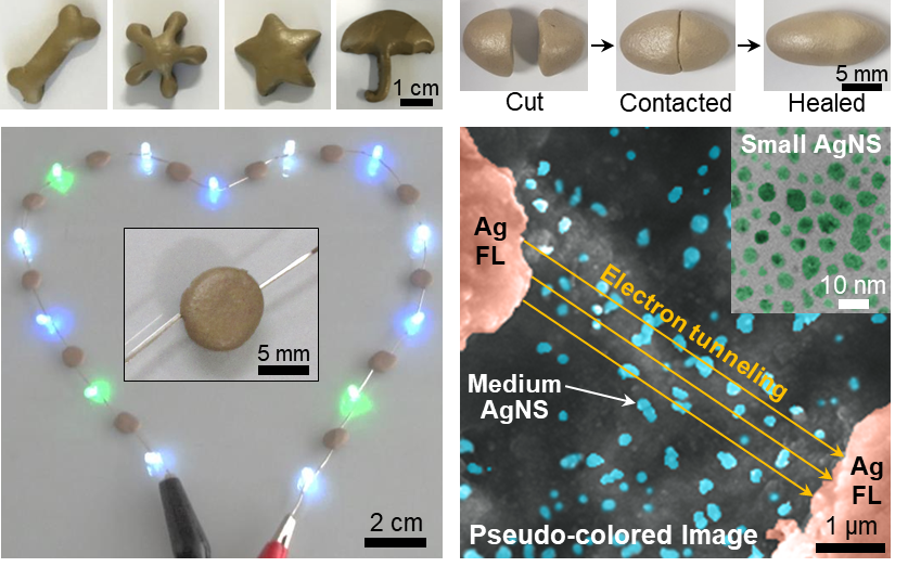 Here we report the highly conductive completely reversible electron tunneling-assisted percolation network of silver nanosatellite (AgNS) particles for putty-like moldable and healable nanocomposites (Fig. 1). The densely and uniformly distributed hierarchically structured AgNS particles with a bimodal (medium and small) size distribution are generated by the radical and reactive oxygen species-mediated vigorous etching and reduction reaction of silver flakes using tetrahydrofuran peroxide in a healable silicone rubber matrix.