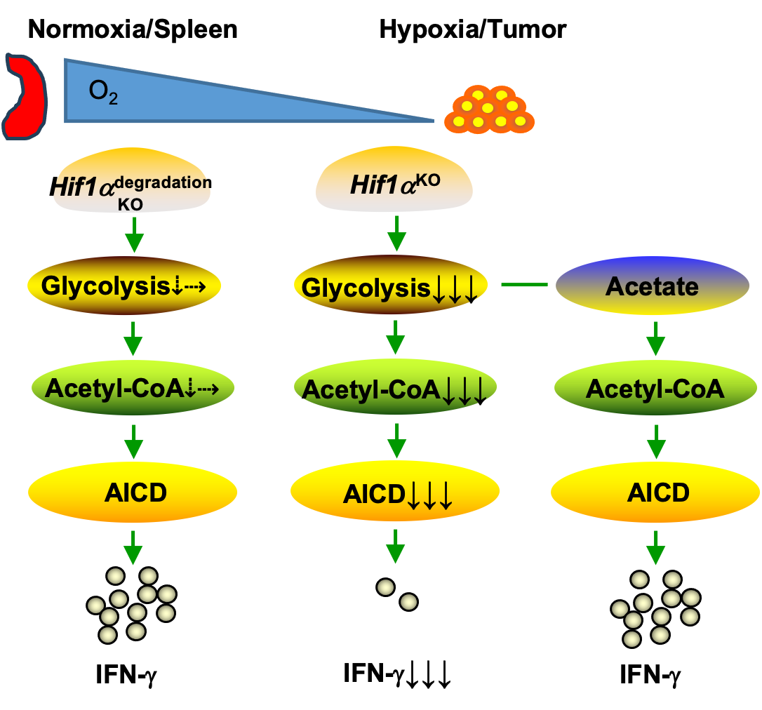 In this study13, combining genetic mouse models, metabolic flux analysis using 13C-labeled glucose tracing assay and Seahorse analyzer, and pharmacological approaches, we show that HIF1a-glycolysis is indispensable for IFN-g induction in hypoxic T cells. HIF1a deletion and glycolytic inhibition drastically reduces IFN-g induction, whereas HIF1a stabilization greatly augments IFN-g production. The HIF1a-glycolysis axis, by sustaining intracellular acetyl-CoA and activation-induced cell death (AICD), governs T cell effector functions and responses to immune checkpoint blockade (ICB). Acetate supplementation, by restoring the intracellular acetyl CoA as well as H3K9Ac expression in the promoter and regulatory regions of Ifng gene in Hif1a KO T cells, enhances Ifng transcription and rescues IFN-g production and tumor-killing capacity of Hif1a KO T cells; it also resensitizes Hif1a KO mice bearing tumors to ICB therapies.