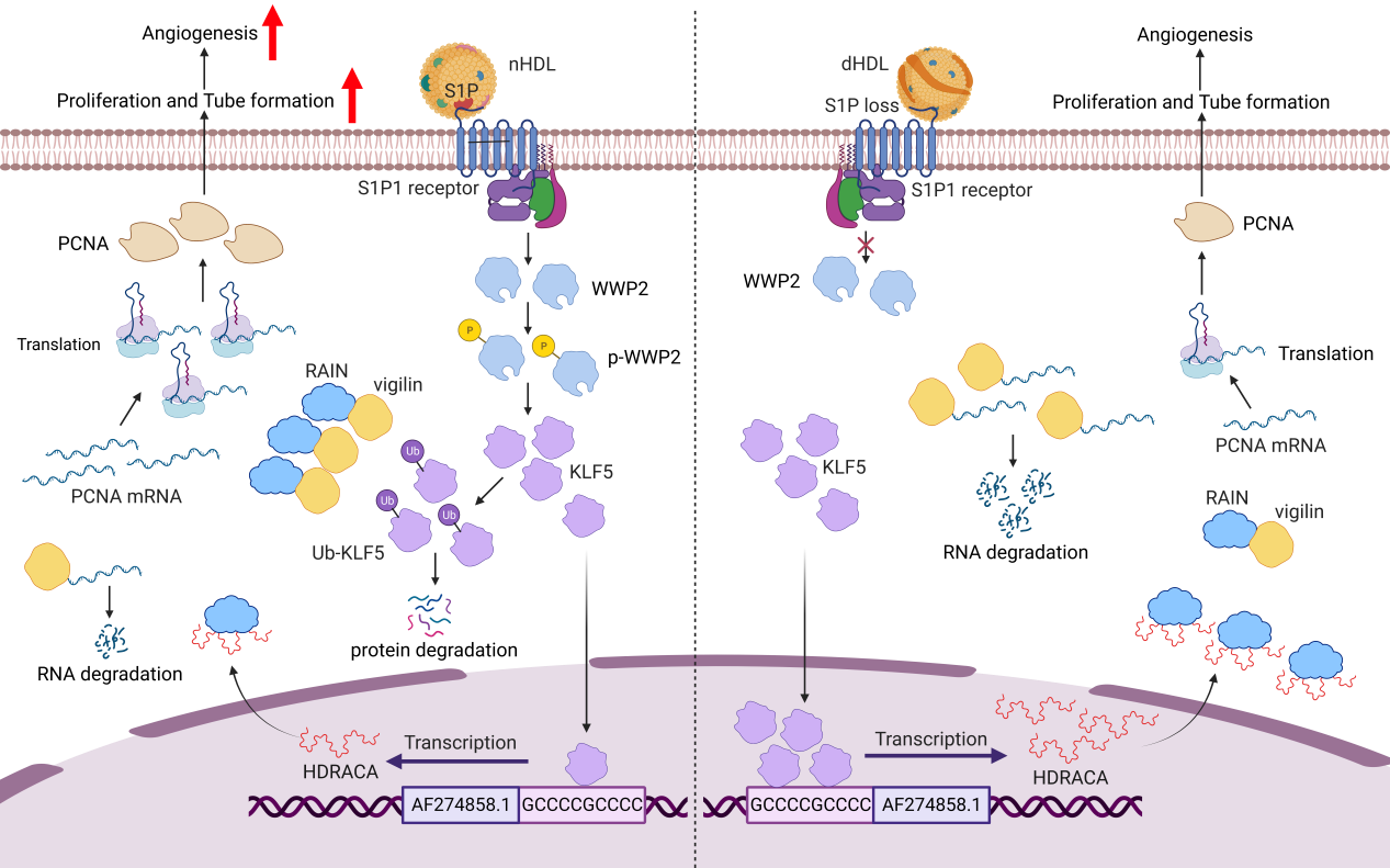 LncRNA HDRACA is involved in the high-density lipoprotein (HDL) regulation of angiogenesis. Normal HDL (nHDL) inhibits the expression of HDRACA to induce angiogenesis, and dysfunctional HDL (dHDL) is much less effective in inhibiting HDRACA expression and inducing angiogenesis.