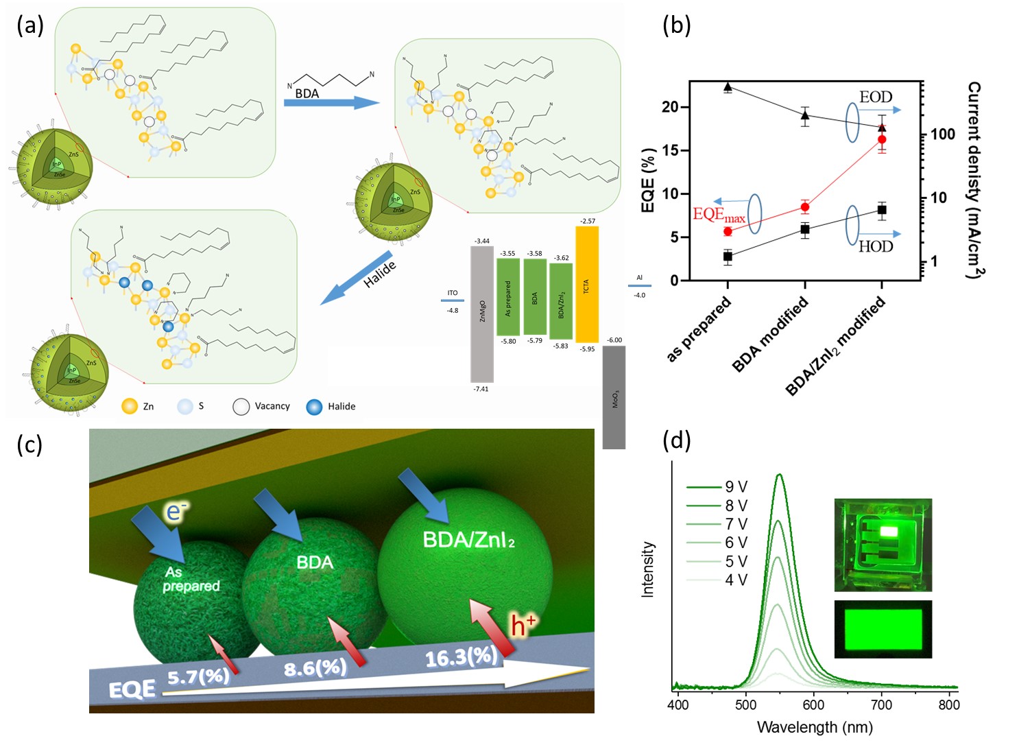 Figure 1. (a) The schematic diagram of InP GQDs passivated by the synergistic effect of BDA combined with zinc halides. (b) The comparison among as prepared, BDA modified, and BDA/ZnI2 modified InP GQD devices. (c) The illustration shows the relationship between the passivation process and the electron/hole balance that affects EQE. (d) The voltage-dependent electroluminescent spectra of the QLED with BDA/ZnI2 modification. Inset: photographs of the operating devices.