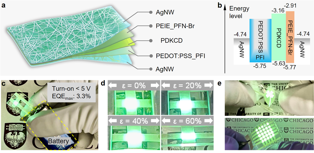 We believe the feasible strategy to develop highly efficient stretchable light-emitting polymers based on the TADF mechanism would open up a much wider platform for further improvements of stretchable OLED performance. In academia, we anticipate that this will create numerous research opportunities to achieve high efficiency in stretchable TADF devices with emitters in various colors, longer lifetimes, and higher brightness. In industry, it would offer considerable potential for a wide range of applications, particularly in the field of stretchable optoelectronic devices used in human-interactive applications, including but not limited to on-skin display, wearable sensors for blood oxygenation/heart rate, and implantable light source for optogenetics.