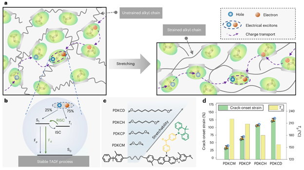 To break such fundamental efficiency limitation, our recent work published in Nature Materials focuses on the new generation of OLED emitters, known as thermally activated delayed fluorescence (TADF) emitter. TADF emitters, with the fine molecular design, can realize 100% of exciton harvest by allowing the up conversion of the triplet excitons to the singlet excitons. But the realization of stretchable properties for this class of emitters has remained an open challenge, due to the significantly more complicated photophysics process compared with the conventional FL emitters.
