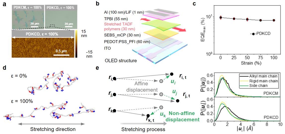 In order to provide a comprehensive understanding of our newly developed stretchable TADF polymers, we conducted a thorough investigation of their characteristics and properties. This included analysis of their basic photophysical properties, performance in EL devices, density functional theory calculations, and molecular dynamics simulations (Fig.2). Counter-intuitively, our findings show that the incorporation of alkyl chains into the polymer has minimal impact on the photophysical and EL properties of the TADF materials, while realizing high levels of stretchability. The details can be found in our published paper.