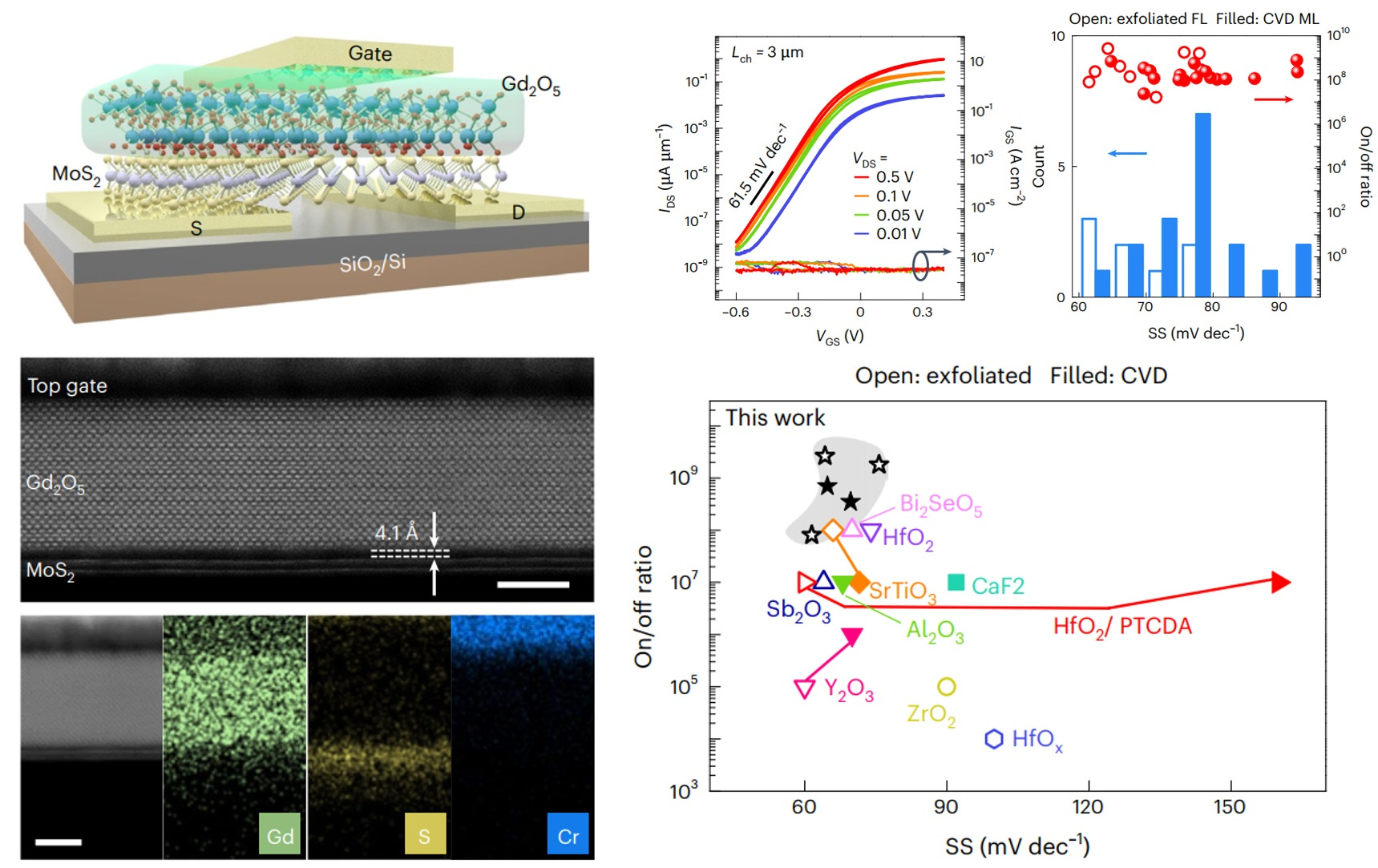 Prof. He’s group successfully synthesized single-crystal 2D gadolinium oxide thin films via van der Waals epitaxy, achieving both high dielectric constant (~25.5) and wide bandgap. Under an electric field of 5 MV cm-1, the 2D gadolinium oxide, with an equivalent oxide thickness as thin as 1 nm, exhibited exceptionally low leakage current (10-4 A cm-2), meeting the IRDS requirements for low-power devices. Furthermore, through van der Waals interactions, seamless integration of single-crystal gadolinium oxide with 2D semiconductors was achieved. The high-κ dielectric environment and high-quality gate dielectric/semiconductor interface enabled the fabricated 2D transistors to demonstrate exceptional modulation capabilities under low operating voltages, featuring an on/off ratio exceeding 109, a subthreshold swing approaching the Boltzmann physical limit, and effective suppression of short-channel effects. The inverter circuits constructed by the low-power 2D transistors achieved a gain of 40 and an ultra-low power consumption of merely 3.5 nW.