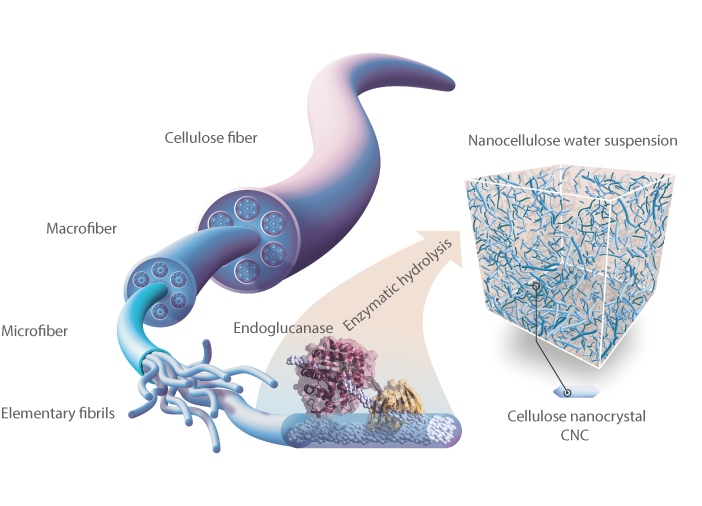 This work just published in Communications materials was the main project of my Ph.D. thesis. The idea came up when we asked ourselves if we could produce nanocellulose with a single enzymatic method. Nanocellulose is a natural polymeric material that has attracted the attention of the research community because of its extraordinary physicochemical properties. Nanocellulose is extracted from cellulose whose hierarchical organization renders different types of nanomaterials (see Fig 1), one of the most interesting are cellulose nanocrystals (CNC). This small crystal has a length ranging from 100 to 500 nm and is currently produced by chemical hydrolysis using sulfuric acid. This hazardous process leaves sulfuric groups on the surface, changing CNC properties. Therefore, novel production methods are needed to achieve sustainable bio-based technology for CNC production and to keep cellulose properties intact.