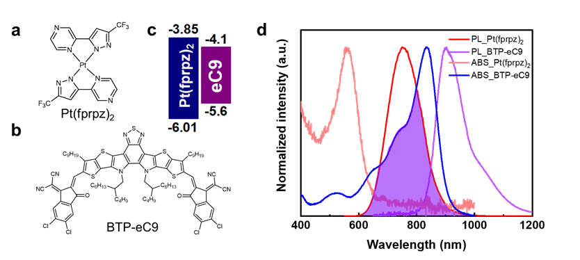 General information on Pt(fprpz)2 and BTP-eC9. a Chemical structure of Pt(fprpz)2 and b BTP-eC9 molecules, along with c their energy levels. d Absorption and emission spectra of Pt(fprpz)2 and BTP-eC9, with the overlapping region indicating the radiative energy transfer zone.