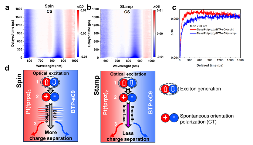 TA results of films treated with spin or stamp methods. Pseudo-color plots of the picosecond transient absorption (ps-TA) spectra for a Pt(fprpz)2/BTP-eC9 spin-coated film and b Pt(fprpz)2/BTP-eC9 stamped film. c The time-dependent transient absorbance (ΔOD) of Pt(fprpz)2/BTP-eC9 spin-coated and stamped films was monitored at 780 nm. d Schematic diagram of exciton dynamics at interfaces prepared by different methods. Process (1): Optically excited exciton generation. Process (2): The spontaneous orientation polarization in the interface facilitates the charge-transfer (CT) formation and (3) subsequent charge separation (CS). Left of d: The bulk heterojunction (BHJ) formed due to spin-coating leads to abundant interfaces, providing sufficient driving force for CT formation that undergoes charge separation. Right of d: The smooth and plane interface produced by stamping facilitates the production of fewer CT states and, thus, fewer CS separations.