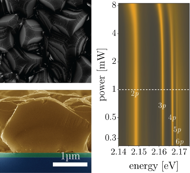 In our recent article, we demonstrate the growth of high-quality Cu2O microcrystals via a scalable thermal oxidation process. Figure 1 shows scanning electron microscope images of the sample morphology (top-view and cross-sectional image in left top and left bottom panel, respectively). Photoluminescence spectroscopy down to milli-Kelvin temperatures showed very low defect and impurity levels. Moreover, photoluminescence from Rydberg excitons was observed (Figure 1, right panel) in a wide range of excitation conditions. The energy levels of the Rydberg excitons followed a quantum number dependence similar to a hydrogen atom.