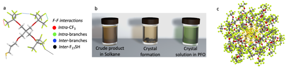 Encouraged by F27SH self-assembly features highlighted by computational studies, we reasoned that, by binding the gold core, F27S- ligand would achieve an optimal spatial distribution that could favour the F···F contacts as key supramolecular tools for the assembly of fluorinated AuNC in the solid state. We therefore developed a modified Brust procedure that afforded fluorinated AuNC (F-AuNC), which were easily dispersed in 1,1,1,3,3-pentafluorobutane (solkane) yielding a brown solution. UV-Vis and Scanning Transmission Electron Microscopy (STEM) techniques revealed that the crude synthetic product presented [Au25(SF27)18]- species together with bigger nanoparticles. After two months, the sample, stored at room temperature, showed the formation of dark crystals that were scarcely soluble in a partially fluorinated solvent like solkane, but dissolved well in a fluorous medium such as perfluorooctane (PFO), forming a green solution (Fig 1b). UV-Vis and MALDI studies clarified that the [Au25(SF27)18]- specie had spontaneously oxidized yielding, in the form of dark crystals, [Au25(SF27)18]0 nanoclusters. Single Crystal X-Ray analysis (Fig 1c) confirmed that the dark crystal was composed of [Au25(SF27)18]0, which, bearing 486 F atoms, represents the most fluorinated nanoobject ever described in the crystalline state.