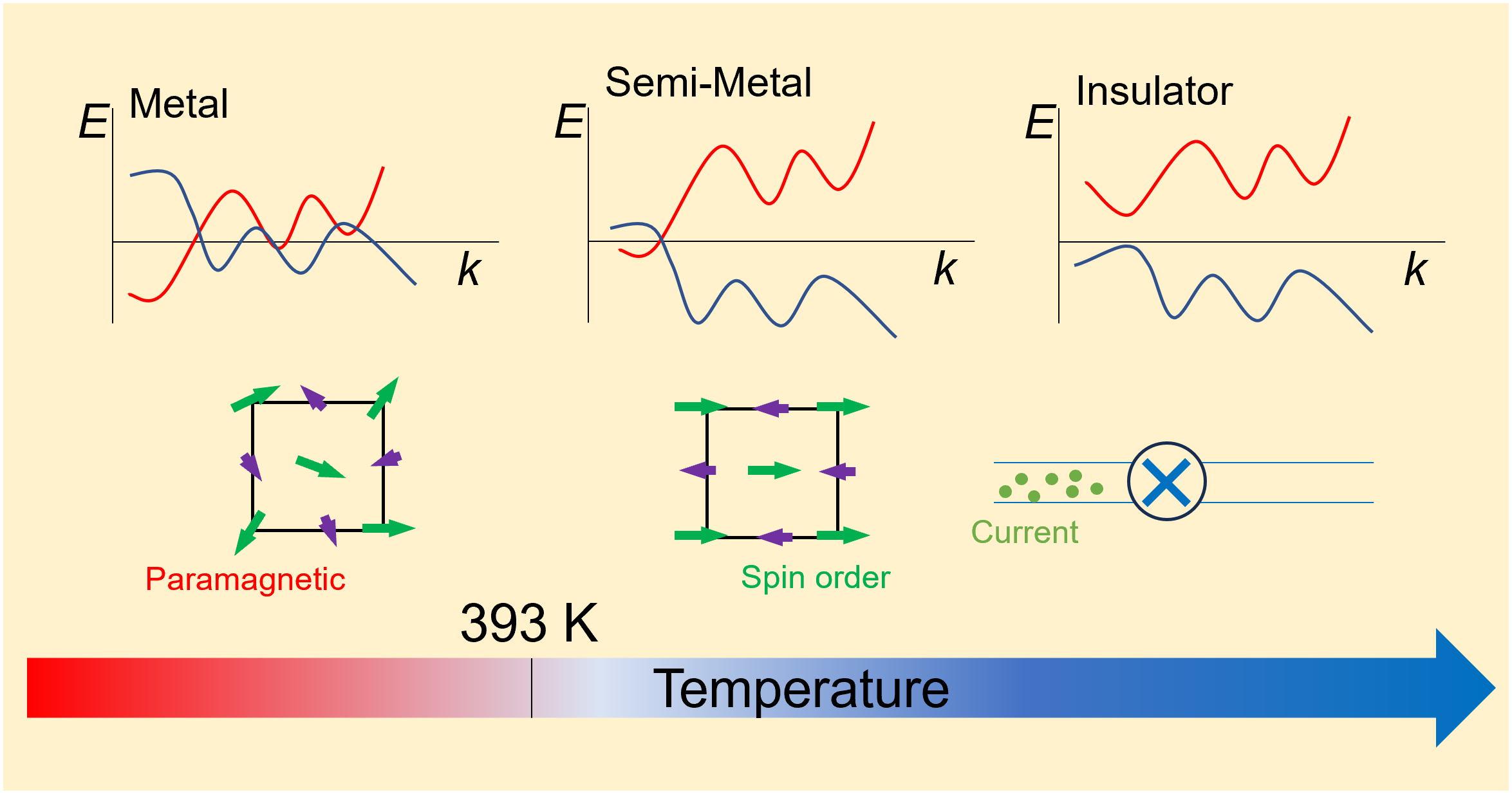Strikingly, we observe a concurrent metal-to-insulator transition (MIT) at the same temperature (shown in Figure 2). Synchrotron XRD and thermal analyses confirm the absence of structural phase transitions, while infrared spectroscopy reveals a gradually opening direct bandgap below the Curie point. The key insight: this insulating phase emerges purely from electronic reconstruction driven by spin ordering. First-principles calculations reveal that the ferrimagnetic order induces substantial band renormalization, resulting in Fermi surface reconstruction. Assisted by spin–orbit coupling (SOC) and moderate on-site Coulomb repulsion (U), a Lifshitz-type MIT transition is realized — distinct from traditional mechanisms and rarely observed in oxide materials.