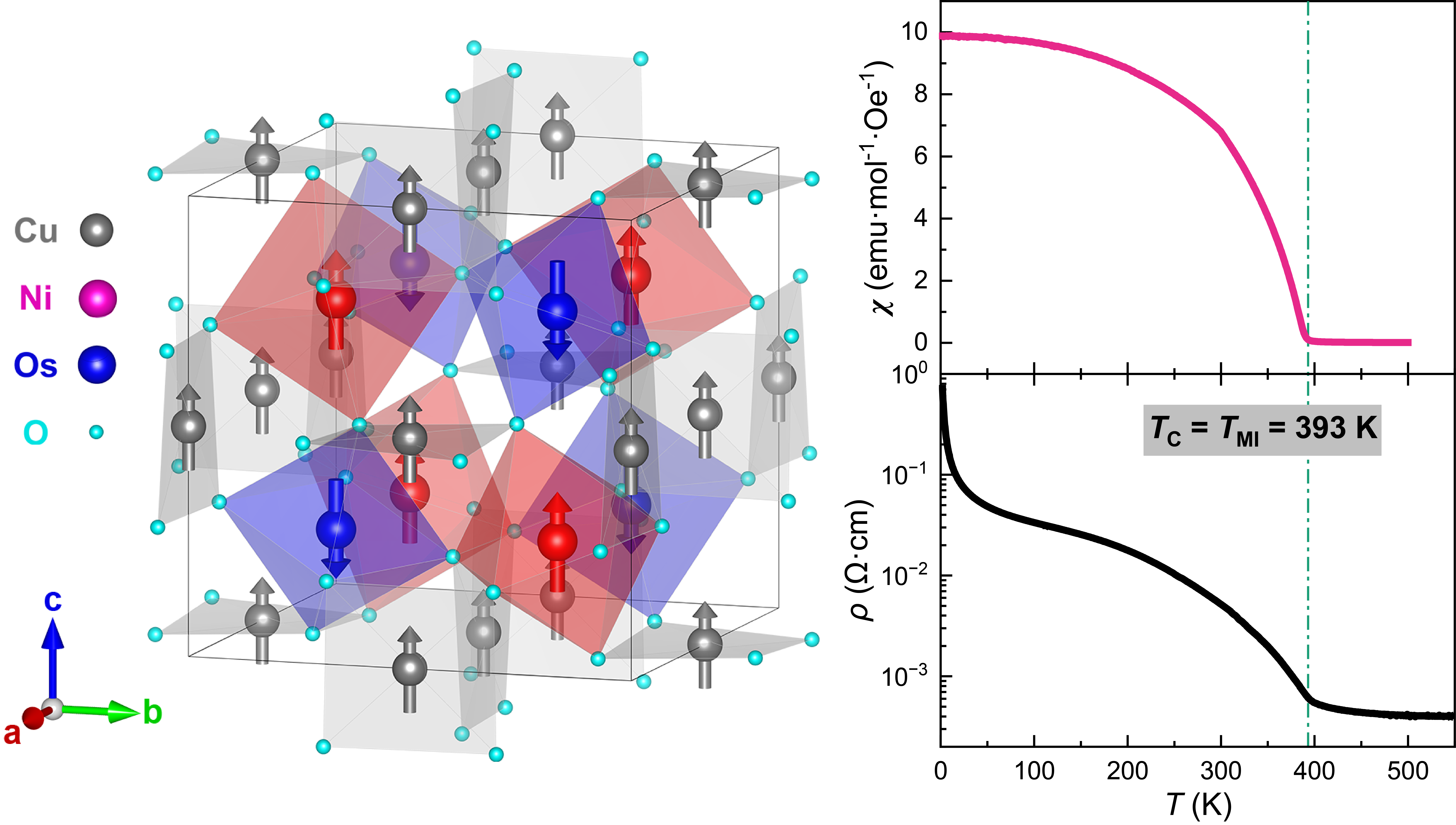 Figure 2. Coupled spin and transport transitions in CaCu3Ni2Os2O12. Left: Schematic magnetic structure illustrating ferrimagnetic ordering with Cu2+ (↑), Ni2+ (↑), and Os6+ (↓) spins aligned along alternating directions. Right top: Temperature dependence of magnetic susceptibility χ(T), showing a ferrimagnetic transition at TC = 393 K. Right bottom: Temperature dependence of resistivity ρ(T), indicating a simultaneous metal–insulator transition (MIT) at TMI = 393K, pointing to strong spin–electronic coupling.