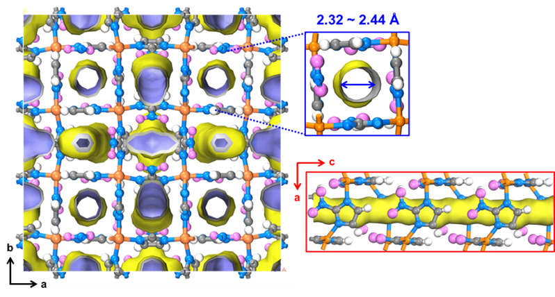 Our research identified Cu-ZIF-gis, a copper-based zeolitic imidazolate framework (ZIF) with ultra-narrow pores (~2.4 Å), smaller than the kinetic diameter of H2 (2.89 Å) (Figure 1).3 Conventional porous materials with the KQS effect typically enable efficient isotope separation only below 77 K, but we observed an unexpected phenomenon: Cu-ZIF-gis exhibited Lattice-Driven Gating (LDG), allowing effective hydrogen isotope separation even above 120 K.