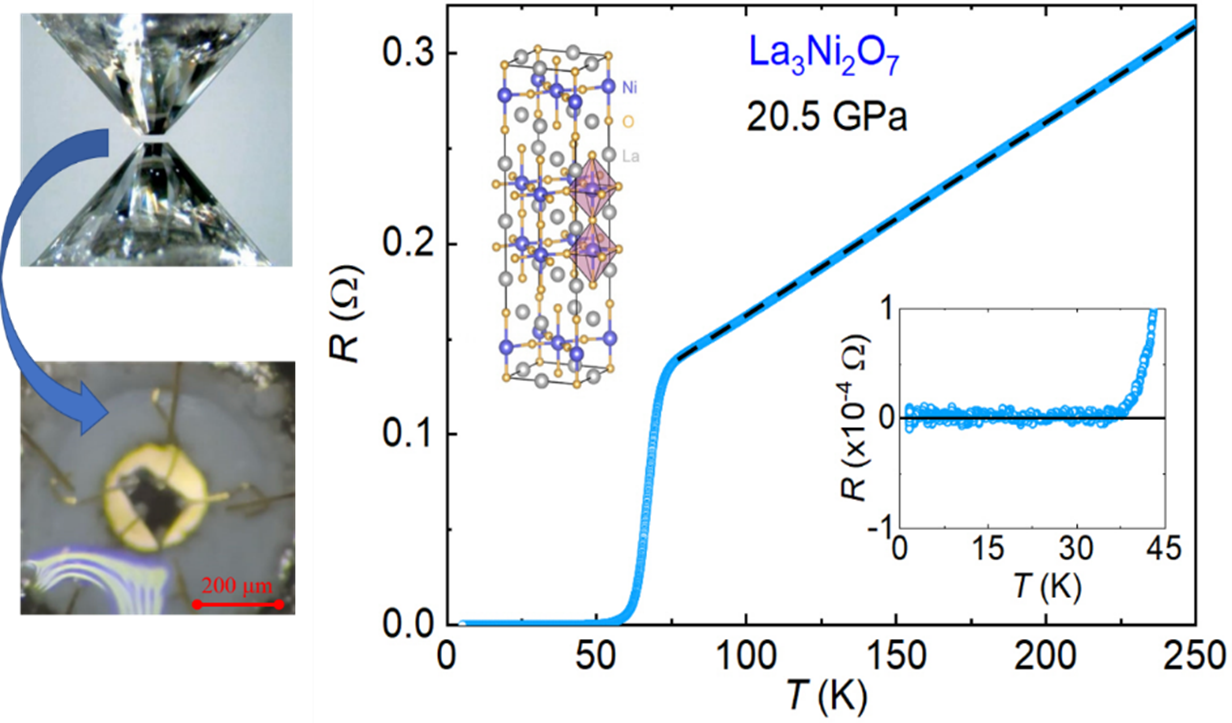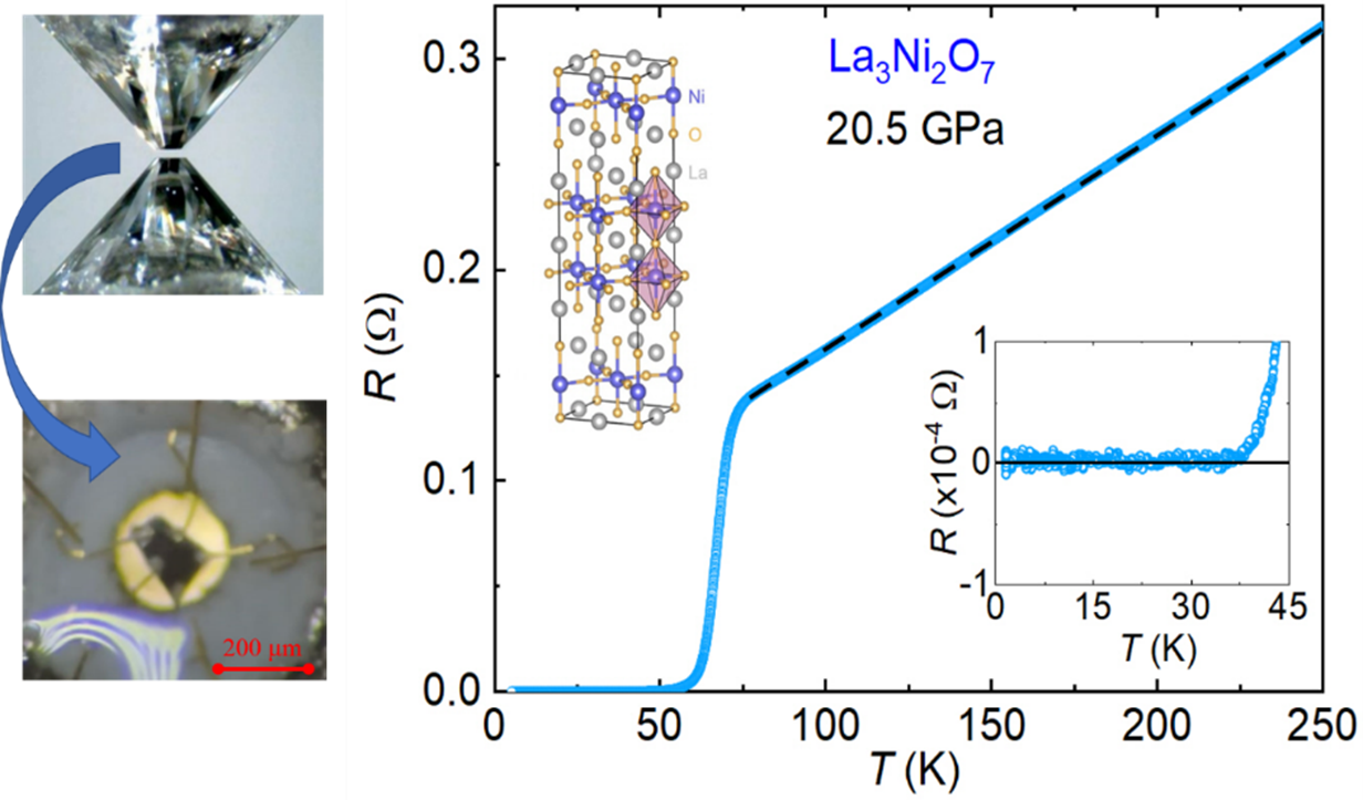 Fig. 1. (Left) The experimental setup for using a diamond anvil cell to apply high pressures to a material sample (shown in the bottom image with 4 wires attached). (Right) Electrical resistance of La3Ni2O7 as a function of temperature under a pressure of 20.5 GPa. There is a sharp superconducting transition below which the electrical resistance drops to zero. At temperatures above the superconducting transition, the resistance increases linearly with increasing temperature, as shown by the straight dashed line, which demonstrates the so-called strange metal phase that is closely associated with superconductivity.