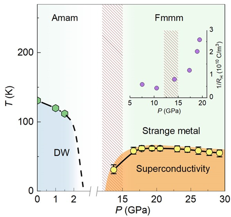 Fig. 2. Phase diagram of La3Ni2O7 as a function of temperature T and pressure P showing the regions with density-wave (DW), superconducting, and strange metal phases. The top right inset shows the pressure dependence of the Hall coefficient, which shows an increase in the number of charge carriers at high pressure.