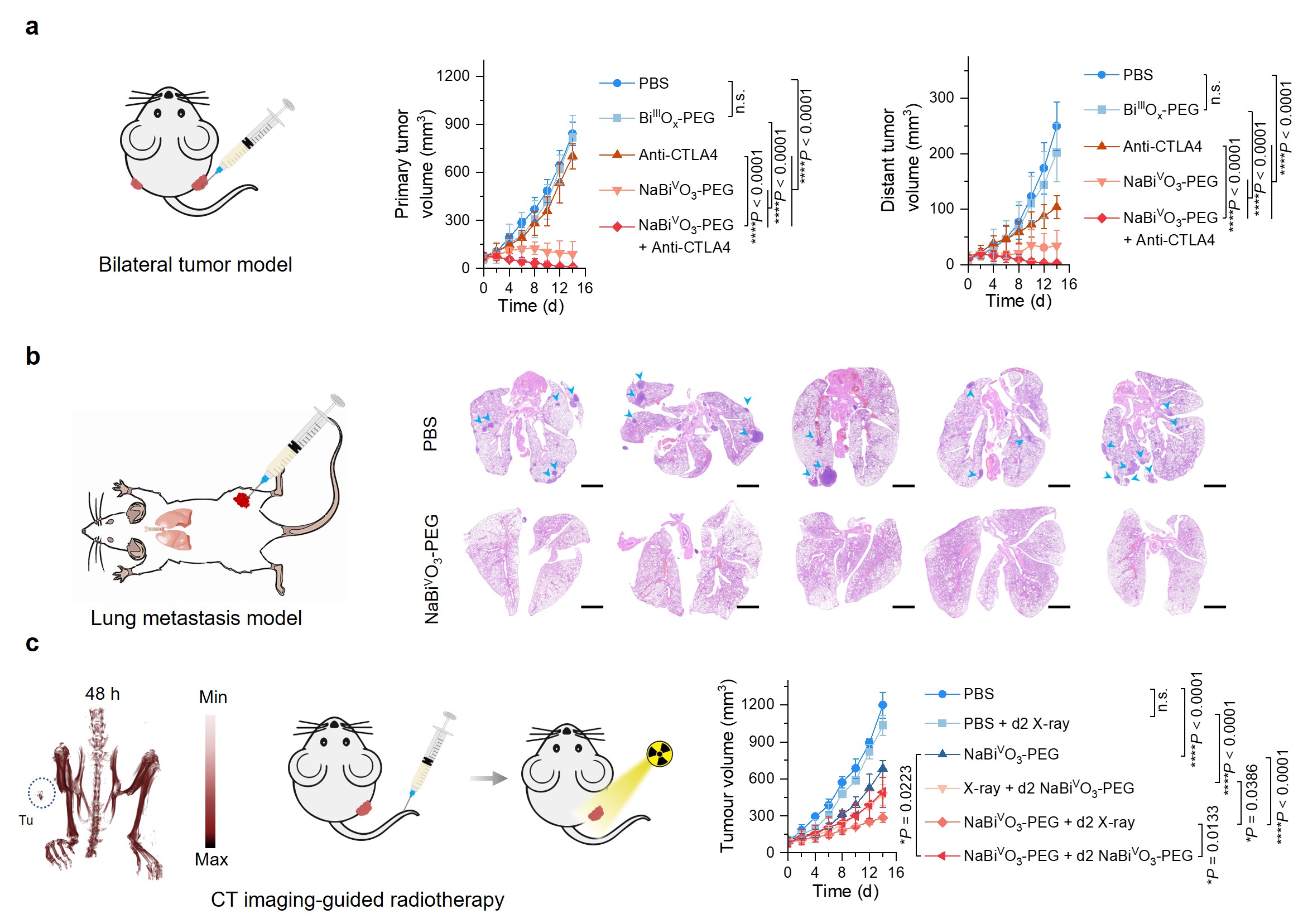 After modification with a PEGylated phospholipid outer layer, we demonstrated the yielded NaBiVO3-PEG-PEG indeed could generate ROS through H+-mediated electron transfer and lattice oxygen migration (Fig. 3c-f). We established three animal models to explore the efficacy of NaBiVO3-PEG in cancer treatment. NaBiVO3-PEG administrated intratumorally produced strong antitumor efficacy and activated systemic antitumor immune responses against distant tumors and tumor metastasis (Fig. 4a,b). NaBiVO3-PEG administrated intravenously could efficiently accumulate and hydrolyze in tumor tissues, which dramatically augmented therapeutic efficiency with alternative real-time CT imaging and on-demand RT capabilities for broader practical scenarios. Interestingly, simply twice intravenous administration of NaBiVO3-PEG also exerted robust tumor inhibition (Fig. 4c).