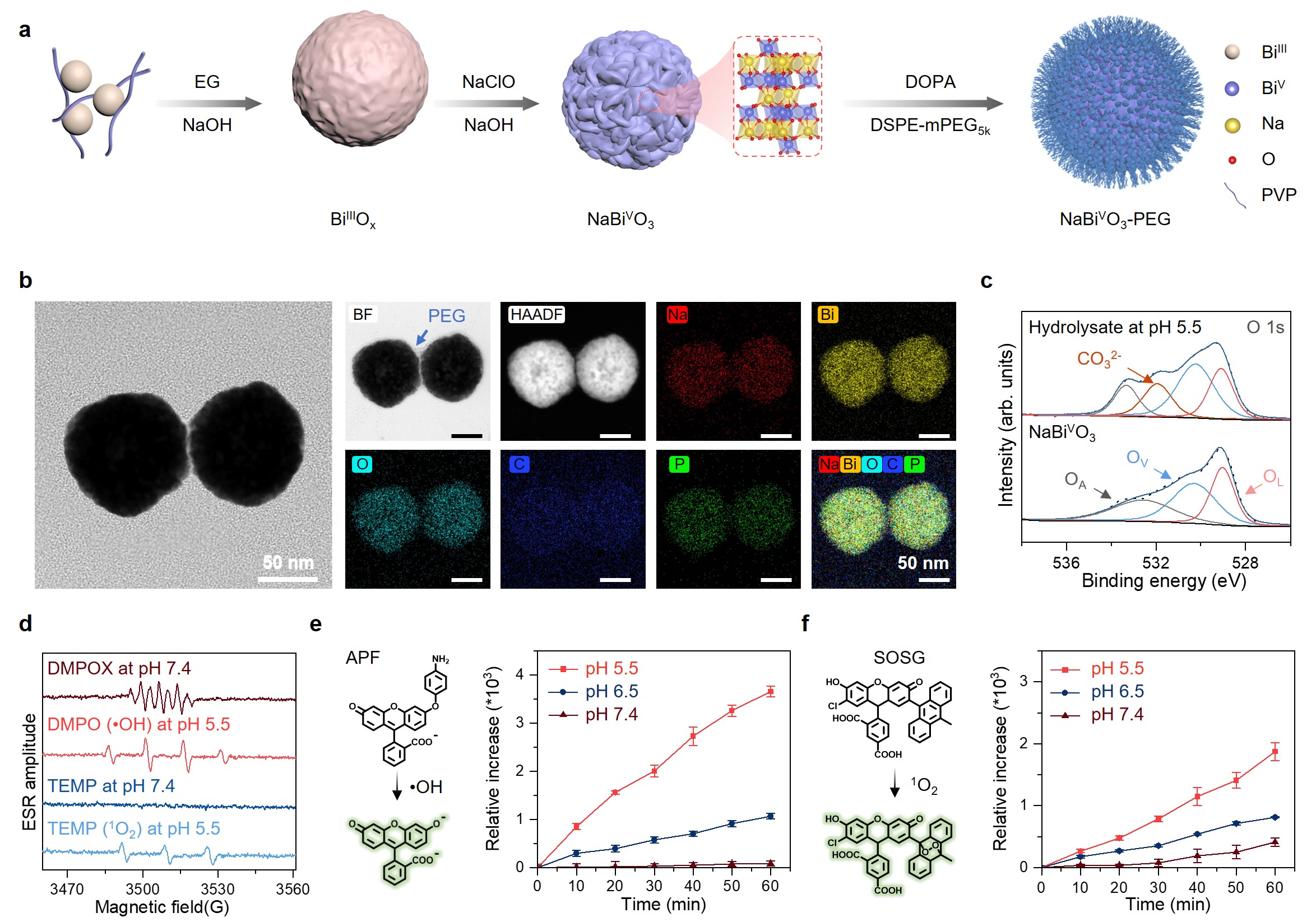 Fig. 3 | a, Schematic diagram of the template-assisted synthesis of NaBiVO3 and surface modification for NaBiVO3-PEG. b, TEM images and elemental mapping images of NaBiVO3-PEG. c, High-resolution XPS spectra of O 1s of NaBiVO3-PEG. d-f, Detection of 1O2 and •OH.
