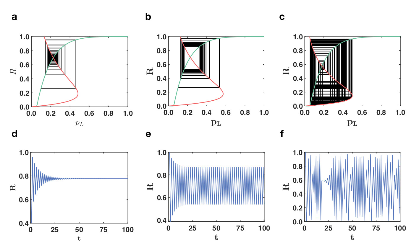 Fig. 2 |Time-varying size of the giant component in percolation. The theory of triadic percolation (panels a-c) predicts a time-varying size of the giant component (panel d-f). The size of the giant component undergoes periodic oscillations (blinking, panels b,e) or a chaotic dynamics (panels c,f) for some parameters while for others can describe a stationary state of the giant component (panels a,d).