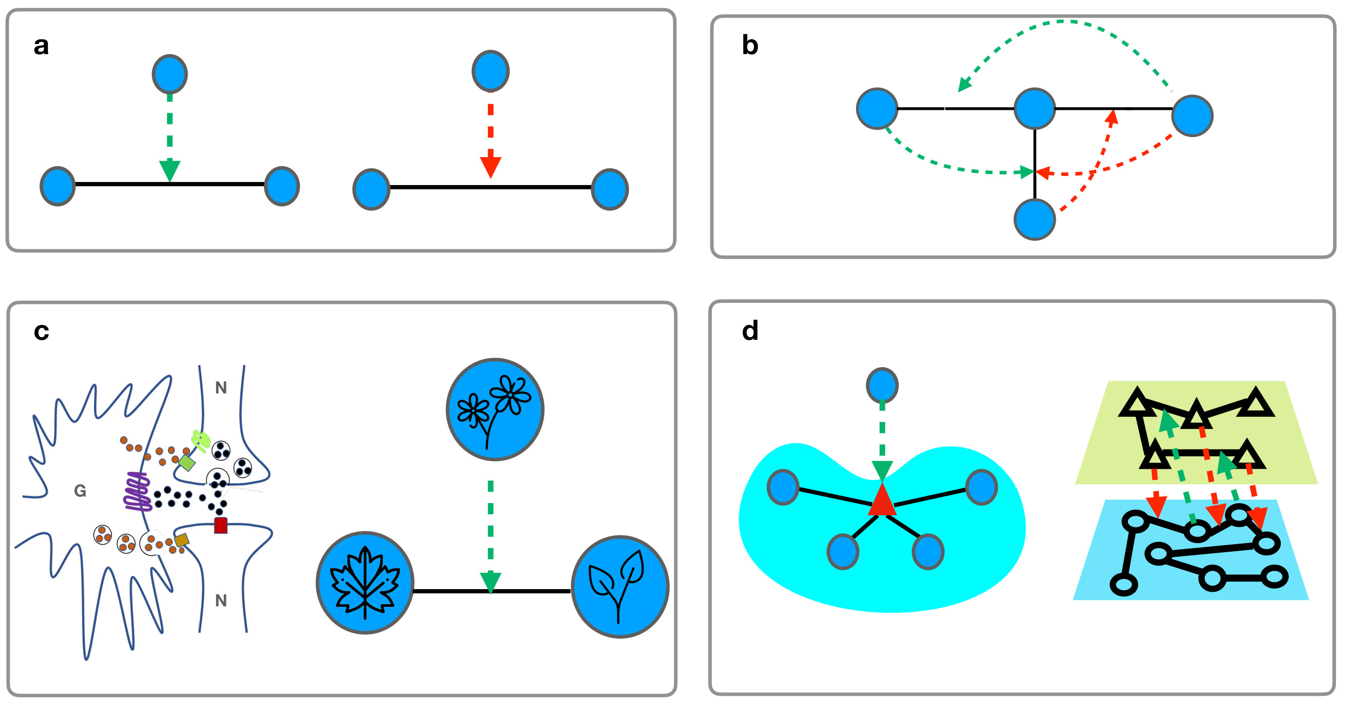 Fig. 1 | Schematic representation triadic interactions. Triadic interactions occur when a node regulates the interactions between two other nodes. Triadic interactions can be signed (panel a) forming a network with triadic interactions (panel b). Panel (c) provides a schematic representation of triadic interactions in complex systems. Panel (d) present the generalization of triadic interactions to hypegraphs and multiplex networks.
