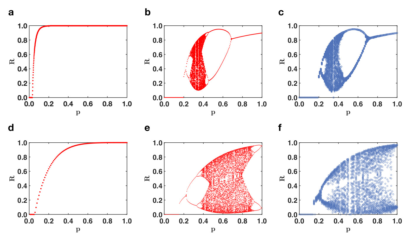 Fig. 3 | The phase diagram of triadic percolation is an orbit diagram. The phase diagram of standard percolation (panel a,d) is drastically changed for triadic percolations (b,c,e,f) on both Poisson and scale-free networks. Panel (b,e) refer to theoretical predictions panels (e,f) refers to MonteCarlo simulations of triadic percolation.