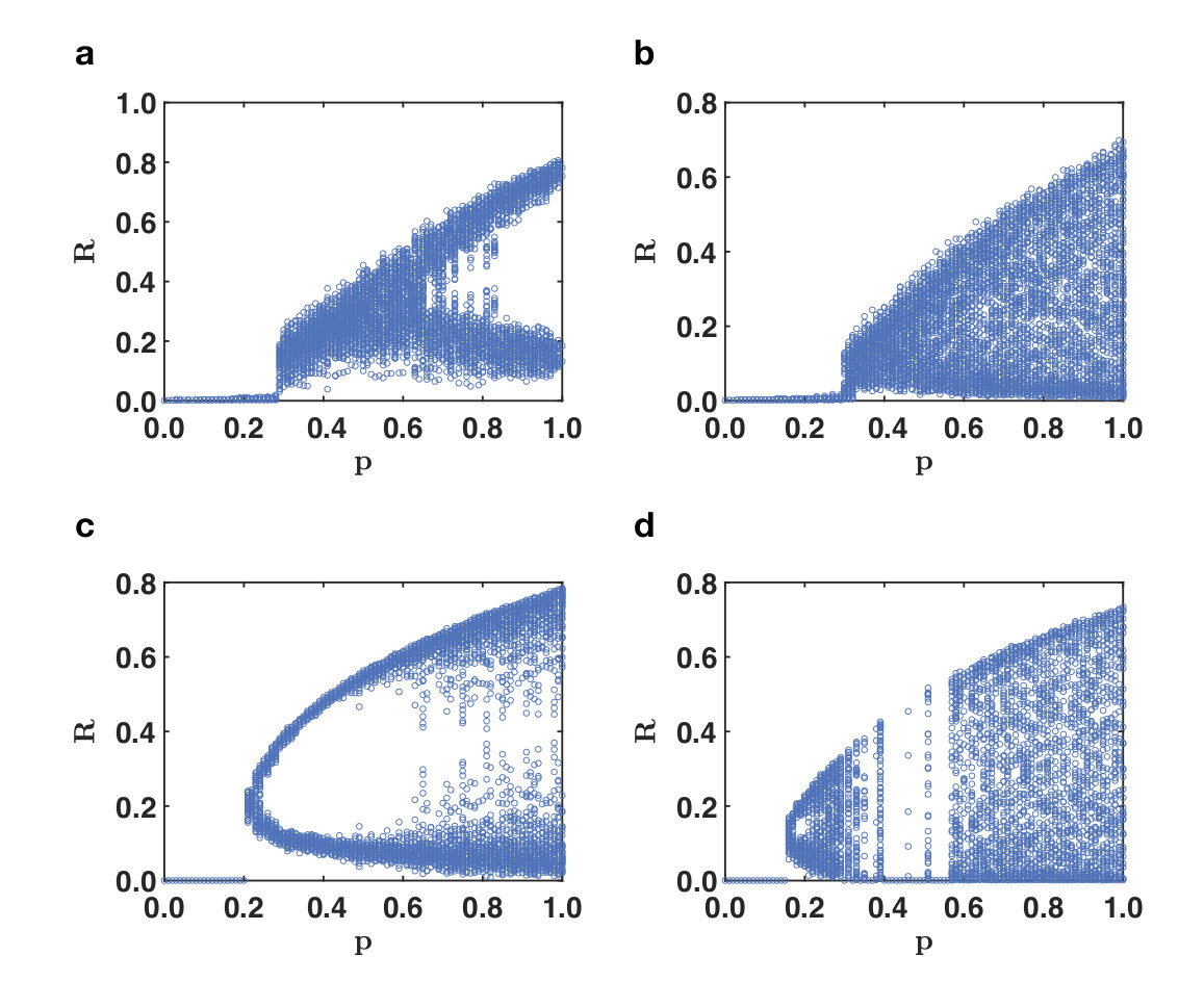 Fig. 4 | Triadic percolation induces blinking and chaos also in the connectivity of real networks. The phase diagram of triadic percolation on the mouse connectome (panels a,b) and the Human bio grid networks with radom triadic interactions (data available at [6]).