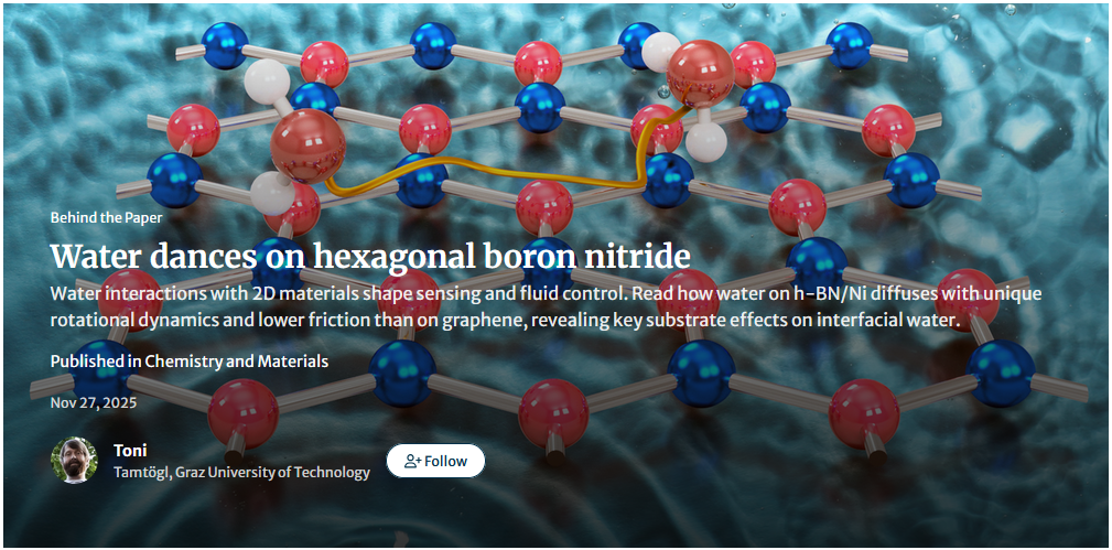 What if a single water molecule could glide, spin, and flip its way across a surface? In this Behind the Paper post, @Toni unpacks how water behaves in surprising ways on hexagonal boron nitride compared with graphene. Using helium spin-echo spectroscopy and simulations, the team reveals that water on h-BN/Ni diffuses with a smooth, rotational “walking” motion — facing far less friction than on graphene.