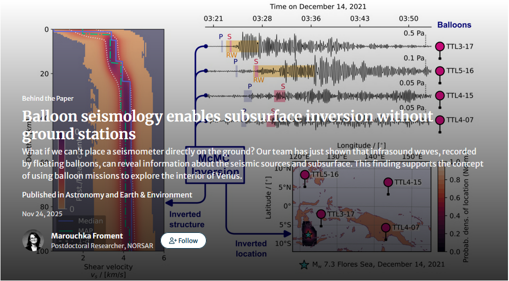 In this Behind the Paper post, @Marouchka Froment shows how balloon-borne sensors can detect quakes without touching the ground. Using infrasound from the 2021 Flores earthquake, her team proved that floating instruments can pinpoint seismic sources and reveal subsurface structure - a breakthrough for worlds like Venus where landers cannot survive.
