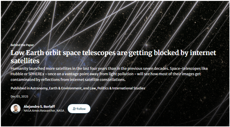 @Alejandro S. Borlaff and his team highlight a startling reality: the same low-Earth orbit that once gave humanity pristine cosmic vision is becoming saturated with thousands of commercial satellites. Once-quiet vantage points for telescopes like Hubble and the upcoming SPHEREx are now streaked with trails of reflected sunlight, obscuring faint galaxies and cosmic structure. Alejandro’s simulations show that as constellations grow, up to 96% of future space-telescope images may suffer contamination, placing astronomical discovery at risk.