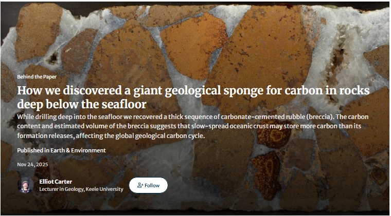 What if the ocean floor hides one of Earth’s largest carbon sponges? @Elliot Carter  ’s blog reveals how drilling into Atlantic crust unexpectedly uncovered rubble-rich breccia cemented with carbonates - a concealed reservoir capable of storing vast amounts of CO₂. Published in Nature Geoscience, this research suggests slow-spreading ocean crust may absorb more carbon than it emits, reshaping how we understand Earth’s deep carbon cycle.