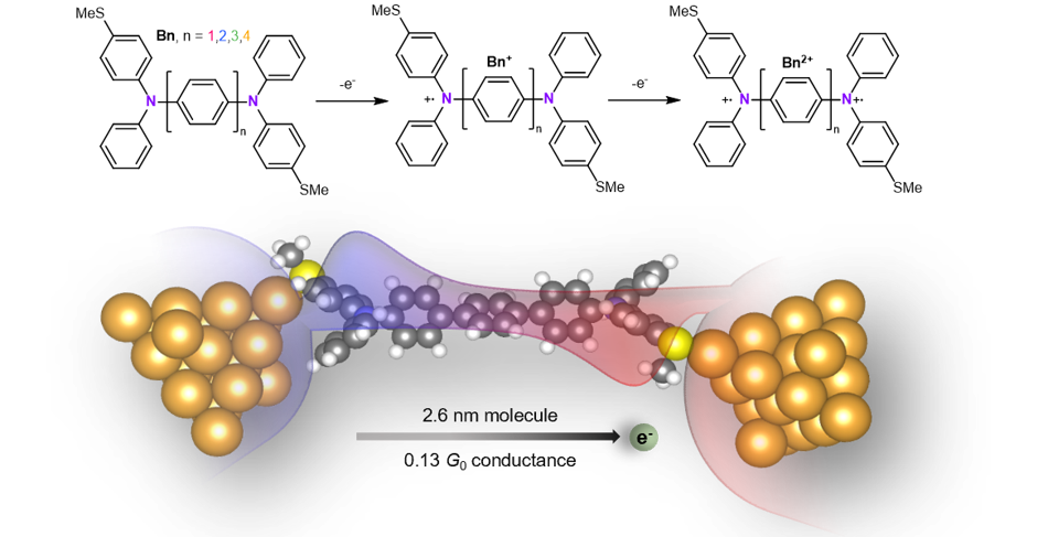 An abstract figure of this work. Top: the two-step oxidation of the bis(triarylamines) molecular series. Bottom: the geometry of the highest conducting trimer (n=3) molecule in the molecular junction. Red and blue regions are artistic depictions on the coupling between the two edge states.