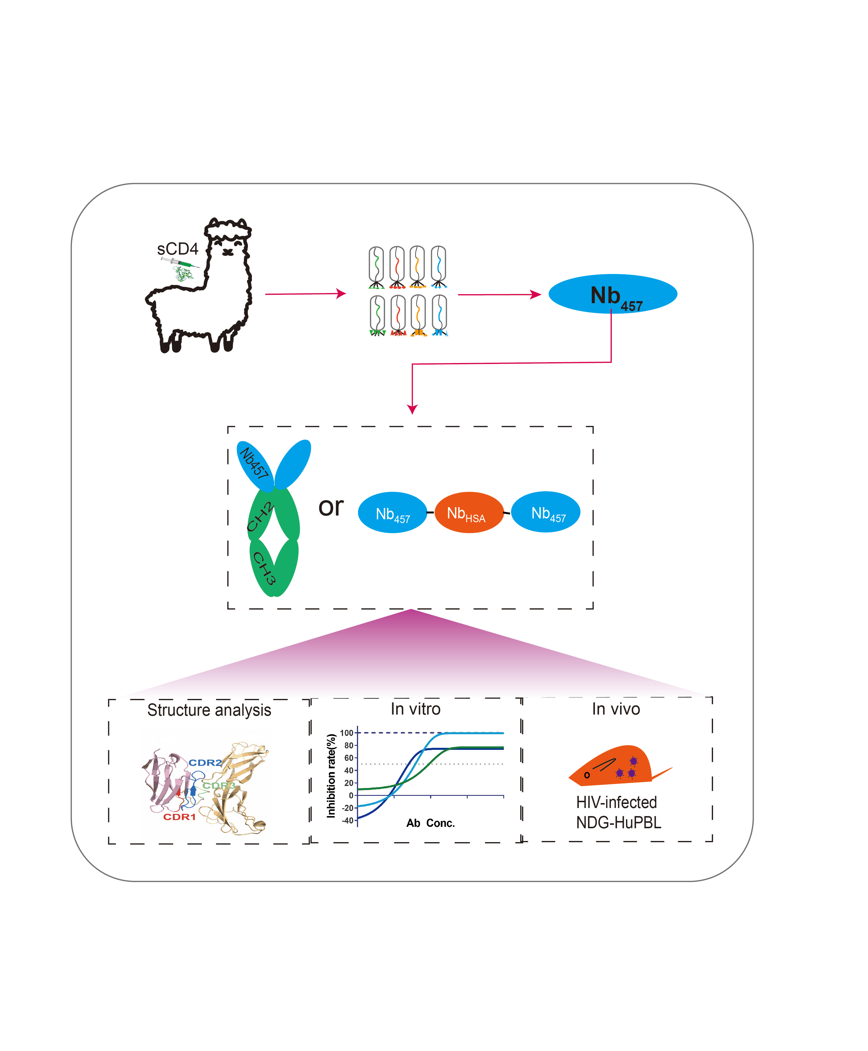 Our breakthrough came with the identification of Nb457, which demonstrated exceptional potency and a broad spectrum of activity against HIV-1. Nb457’s ability to induce a conformational change in CD4, thereby blocking viral entry without impairing CD4+ T cell function, set it apart from existing therapies, including Ibalizumab, the only approved CD4-specific antibody.