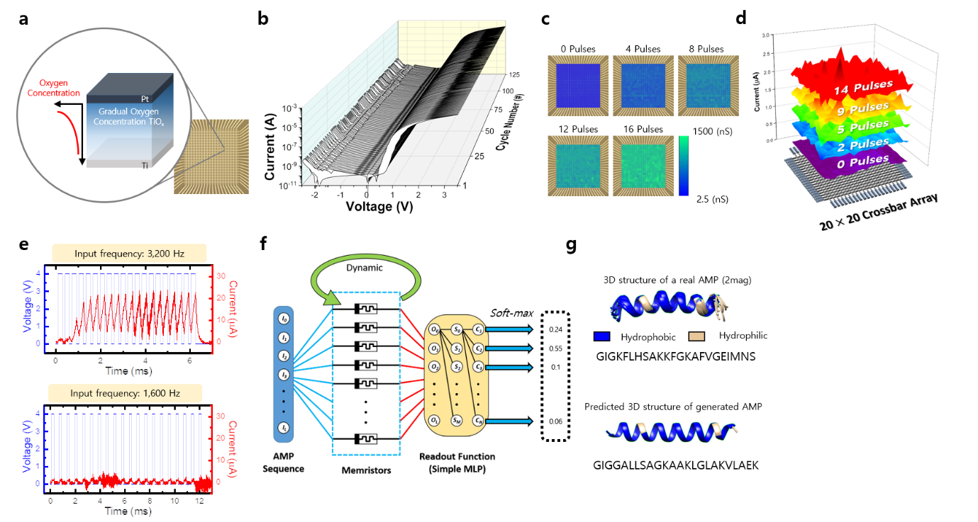 Furthermore, to test the newly developed device beyond the single-cell level, a passive 20 × 20 memristor crossbar array, without selecting devices such as transistors, was fabricated with 100% yield. Because the developed memristor has a self-rectification property, every device in the crossbar array is not interrupted by each other and the device conductance state. This self-rectification property enables the device conductance state to be accurately read without interference from other cells (so-called "sneak-path" problem). We demonstrate that every device in the array uniformly operates and that the device in the array shows similar behaviors to the stand-alone device. A neuro-memristive computing system which trains anti-microbial peptides (AMPs)’ amino-acid sequences and generates new AMP sequences has been simulated based on a model of the developed memristor. Based on the reliable volatile dynamics of the memristor in the crossbar array, the memristors process the sequence information of the AMPs, and a simple multi-layer perceptron (MLP) based read-out function trains its weights by predicting the next amino acid. After training the weights in the read-out function, the neuro-memristive computing system can generate new AMP sequences when a ‘seed’ amino-acid is given. We demonstrate that the real AMPs and the newly generated AMPs have similar peptide structure, molecular weight, hydrophobicity, and composition.