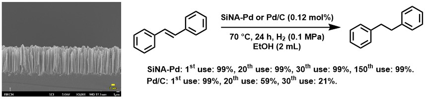 We envisioned that SiNA-Pd, agglomerated with palladium nanoparticles and silicon nanowire array, is a robust and efficient catalyst for hydrogenation. Here, we report the hydrogenation of alkenes using SiNA-Pd (Figure 2). SiNA-Pd mediates the hydrogenation of various alkenes and alkynes including tetra-substituted alkenes to afford the corresponding alkanes as well as to produce margarine in food chemistry. Moreover, when SiNA-Pd (0.12 mol% Pd) is catalyzed for hydrogenation of trans-stilbene under H2 atmosphere (0.1 MPa), diphenylethane is given in 99% yield. SiNA-Pd is readily recovered and reused over 150 times without significant loss of its catalytic activity (Figure 2). In contrast, Pd/C, a commonly used heterogeneous catalyst, is reused with significant loss of catalytic activity (1st use: 99%, 20th use: 59%).