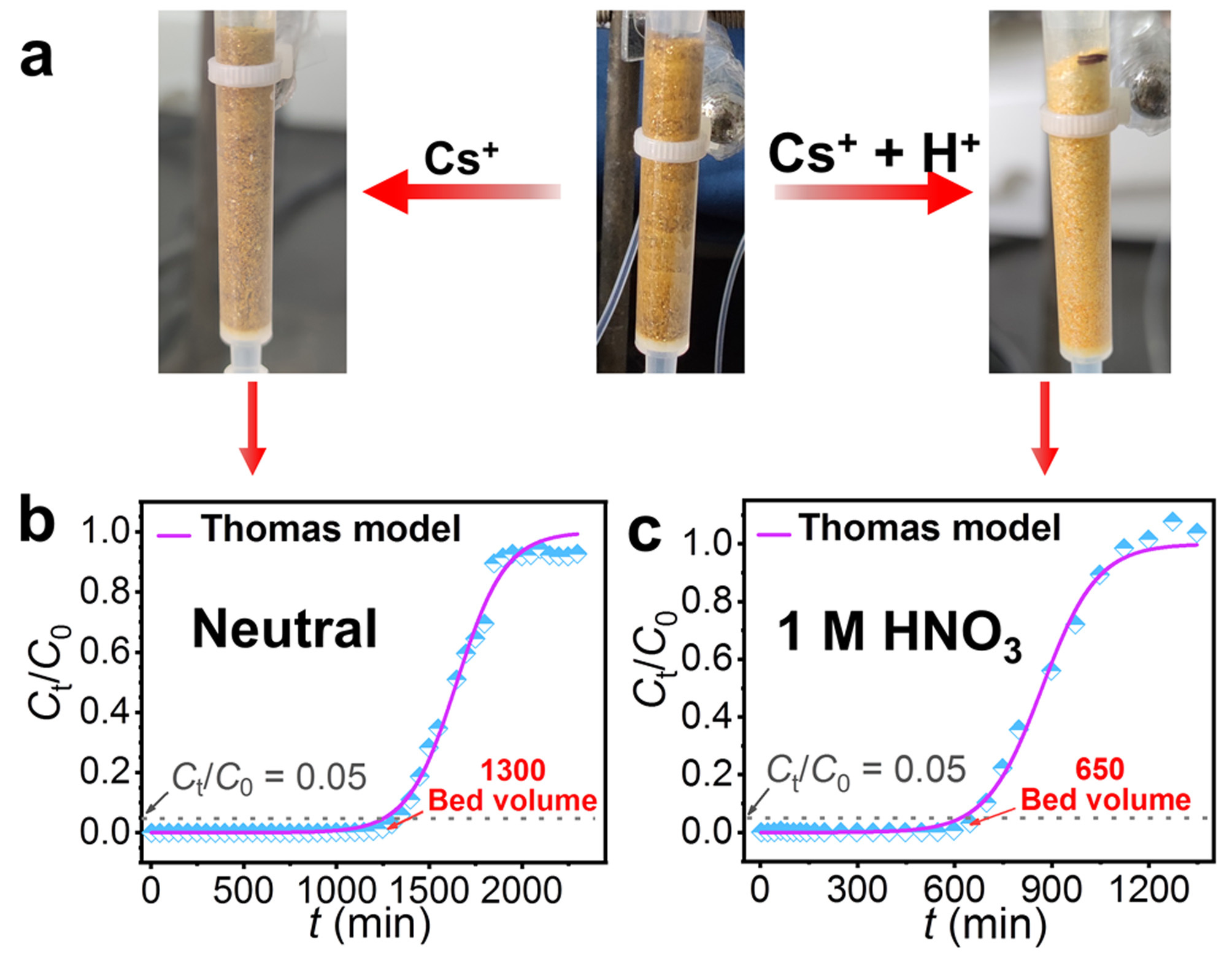 Additionally, the material can be used as a stationary phase in ion exchange columns to effectively remove Cs+ from neutral and acidic solutions containing high concentrations of Cs+, with treatment capacities of 1300 (C0Cs = 190.13 mg/L, neutral) and 650 (C0Cs = 84.25 mg/L, 1 mol/L HNO3) bed volumes, respectively (Figure 4). These excellent properties indicate that InSnS-1 has potential applications in the field of radiocaesium remediation.