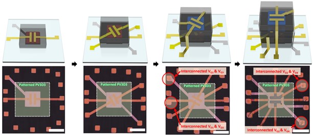Since this method makes metal interconnections without forming via-holes, we call this method “via-hole-less metal interconnect”. Using the proposed via-hole-less interconnect method, we demonstrated three-dimensional organic integrated circuits consisting of 5 transistors. As shown in the fabrication process schematic below, we implemented the organic circuits without the via-hole formation process.