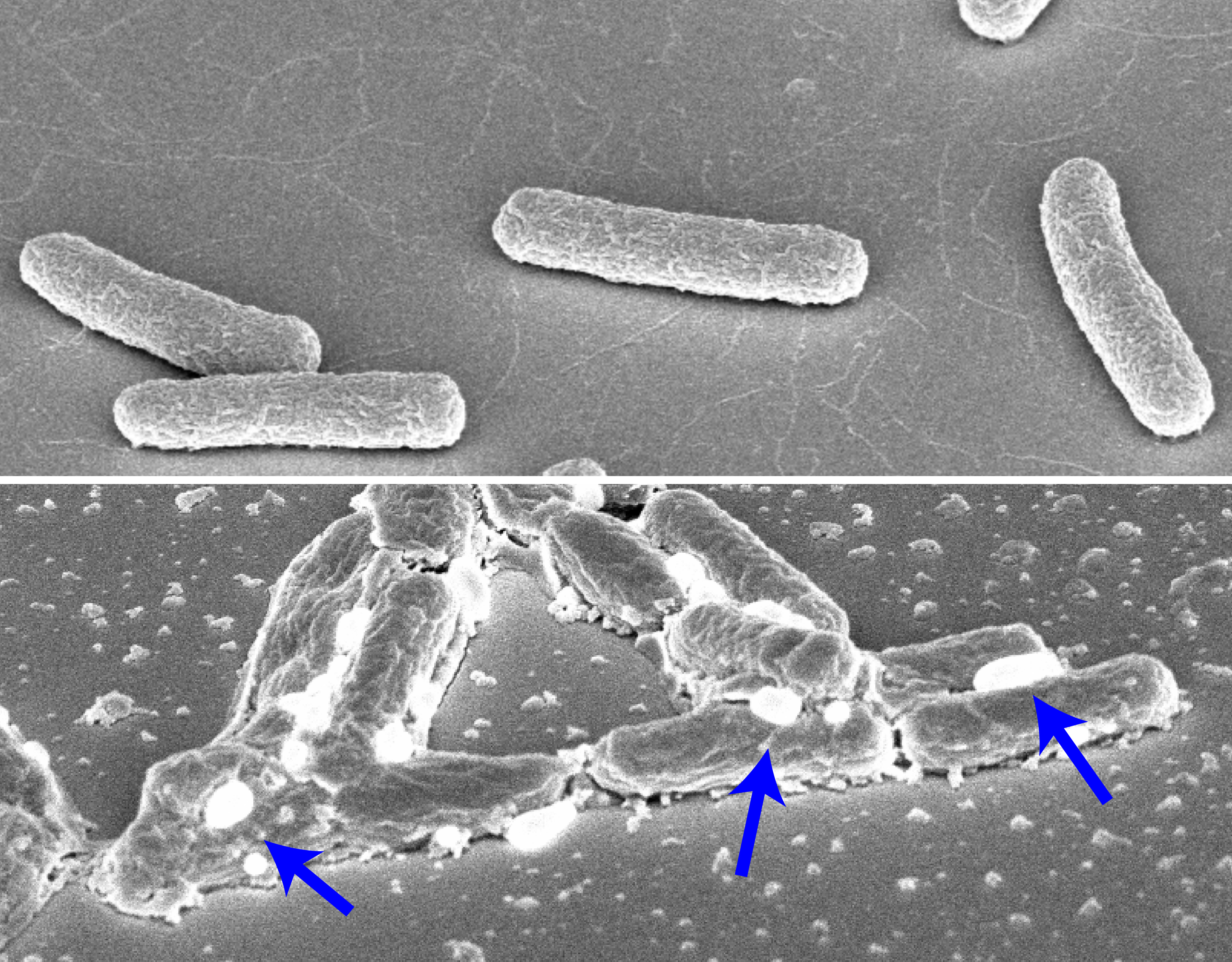 Fig. 1. Synergistic effects of histones and AMPs. SEM images of E. coli that are untreated (top) or are treated with histones and the antimicrobial peptide LL-37 (bottom). Arrows point to structures that bleb from the bacteria.
