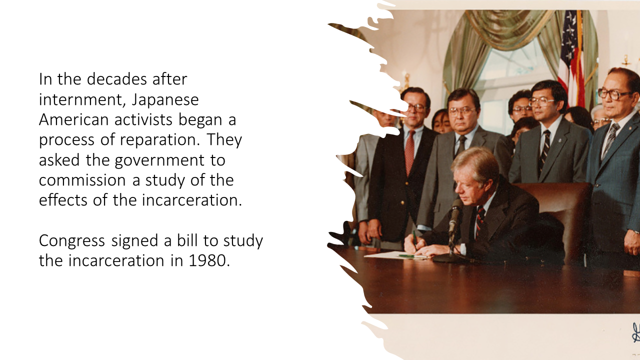 In this particular paper, we study how lessons of history can help Asian Americans make meaning of present injustice. Japanese Americans were not uniformly in favor of redress for incarceration and in fact, many families did not talk about that period of their lives. And if you were not Japanese American, chances are your history books did not say much at all about Asian Americans. These conditions mean that many people in the US, Asian Americans included, are not aware of a relatively recent moment in history when the US government made an attempt to redress past injustice. Without knowing about Japanese redress for the incarceration, Asian Americans may not know that redress is something they can or should expect from their government. As well, learning about redress for an Asian origin subgroup that is close to one's own group might create a moral framework in people's minds that other marginalized groups deserve similar justice and redress for past wrongs .