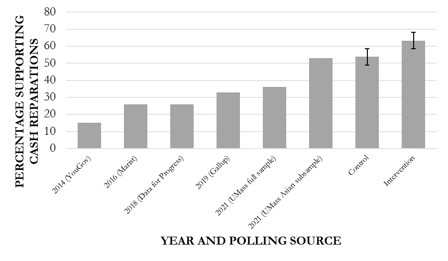 For more than 800 Asian American participants from a variety of origin subgroups (mostly Chinese and Indian American), learning about Japanese redress payments for the incarceration in 1941, versus a control condition that, for instance, reminded participants about the incarceration only, led to an increase in support for federal programs to repair past injustice, for cash payments for reparations for enslavement of Black Americans, and for the study of the effects and impacts of these reparations payments. Importantly, the level of support for cash reparations for Black Americans, observed in our intervention, was higher (63%) than in all other nationally representative polls on the topic conducted up until the study was fielded.