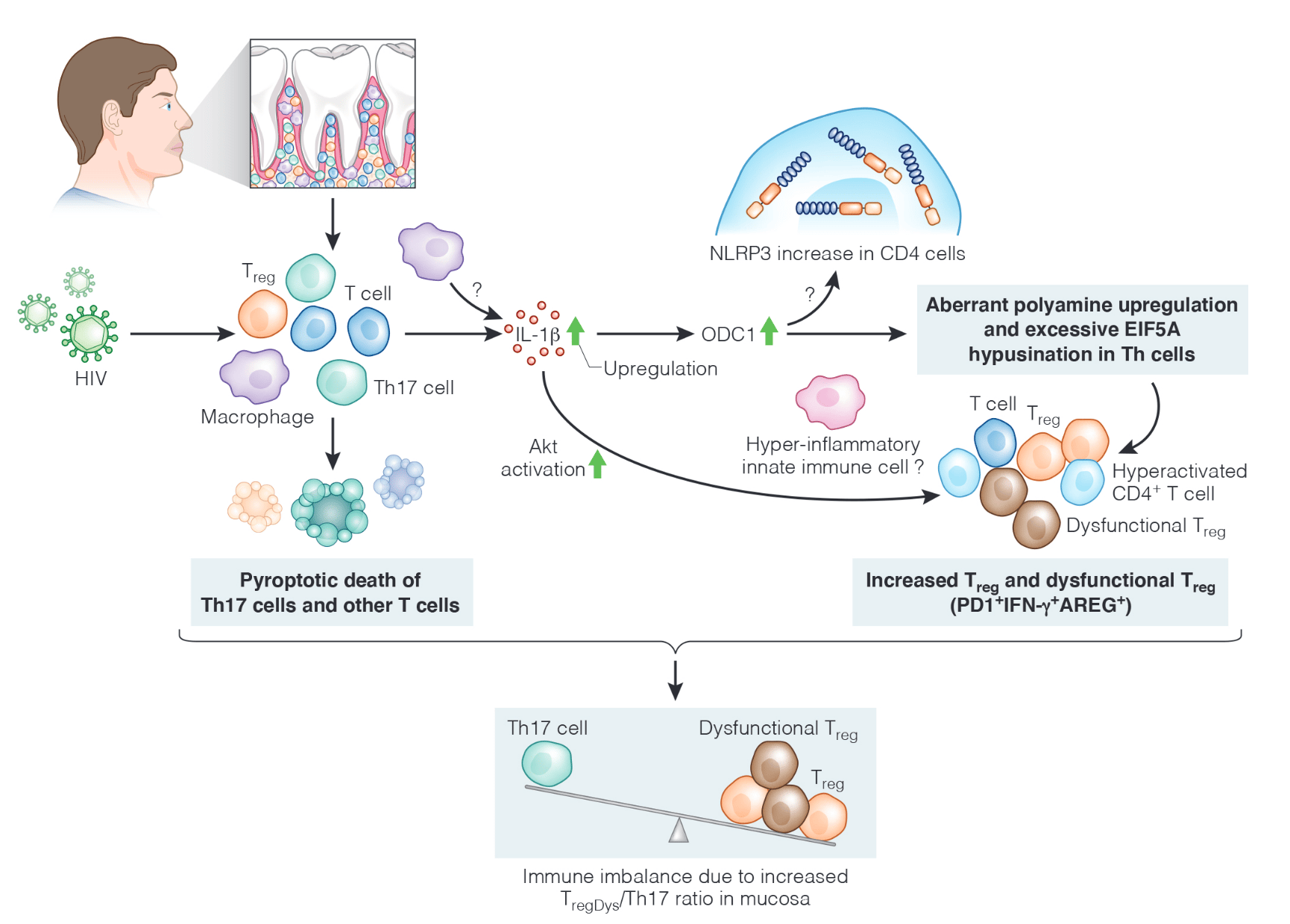 Mechanistic studies using an in vitro human tonsil organoid infection model revealed that HIV infection of T cells also resulted in increased polyamine synthesis, which was dependent on the activities of caspase-1, IL-1β, and ornithine decarboxylase-1 (ODC-1). HIV-1 also led to a heightened expression of polyamine synthesis intermediates including ODC-1 as well as an elevated dysfunctional regulatory T cell (TregDys) /T helper 17 (Th17) cell ratios. The loss of Th17 cells was due to pyroptotic cell death. Blockade of caspase-1 and polyamine synthesis intermediates reversed the TregDys phenotype showing the direct role of polyamine pathway in altering T cell functions during HIV-1 infection. Lastly, oral mucosal TregDys/Th17 ratios and CD4 hyperactivation positively correlated with salivary putrescine levels, which were found to be elevated in the saliva of HIV+ patients. The anti- or hyper-inflammatory effect of altered polyamines on other innate immune cells and the role of increased NLRP3 expression remain to be studied in the future. Thus, by revealing the role of excessive polyamine synthesis during HIV infection, this study unveils a mechanism by which chronic viral infections could drive distinct T cell effector programs and Treg dysfunction.