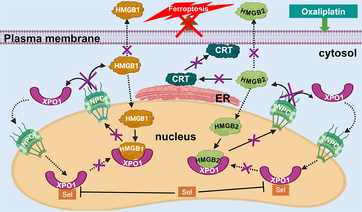 A significant proportion of oxaliplatin-mediated HCT116 colon cancer cell death in vitro occurs through ferroptosis (Figure 1). Ferroptosis is a non-apoptotic type of iron-dependent programmed cell death, involving dysregulation of iron homeostasis and lipid peroxidation. It is characterized by decreased expression of glutathione peroxidase 4 (GPX4), increased production of reactive oxygen species (ROS), increased lipid hydroperoxide generation, increased FeII accumulation, and decreased nuclear factor erythroid 2-related factor 2 (Nrf2) expression. We observed that these five markers of ferroptosis were present after incubation of HCT116 cells with oxaliplatin. Furthermore, co-treatment of the cells with ferrostatin-1, which inhibits FeII-mediated generation of ROS, caused a 28 % decrease in oxaliplatin-mediated cell death. Inhibition of XPO1 with selinexor caused an even greater reduction in cell death (49 %) and reversed the five markers of ferroptosis that were observed with oxaliplatin alone.