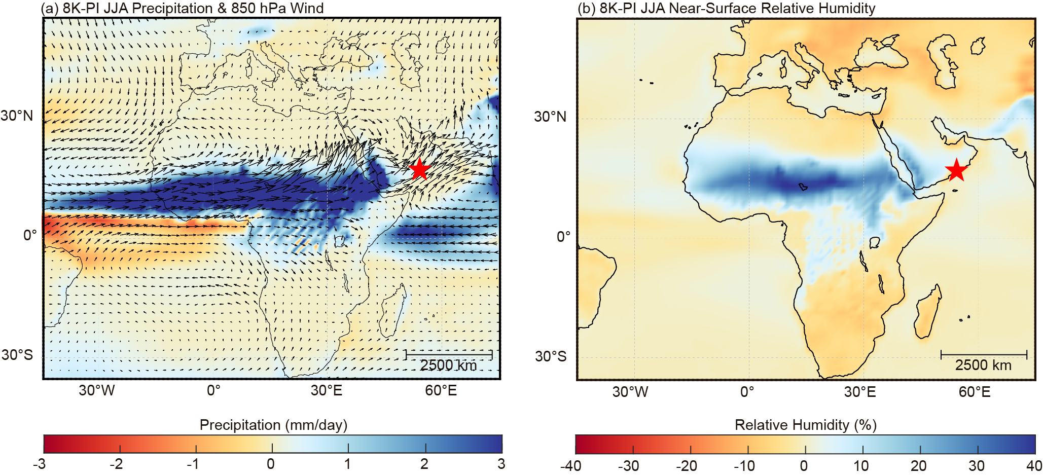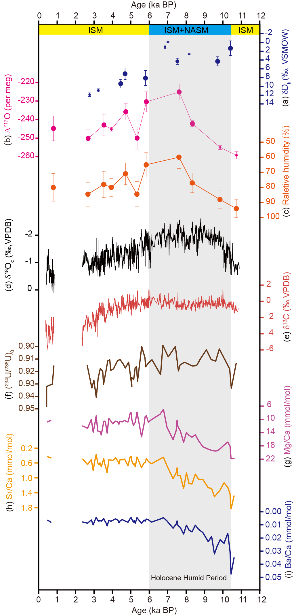 Q5 δDfi, Δ′17O and the relative humidity of moisture source area reconstructed by Δ′17O indicate that the moisture sources or their climate characteristics changed at ~6 ka BP. By comparing 8K and PI simulation results, we found that while the moisture from the Arabian Sea prevails in southern Oman, the North African summer monsoon also contributes water vapor to the area to some extent during the early to middle Holocene.