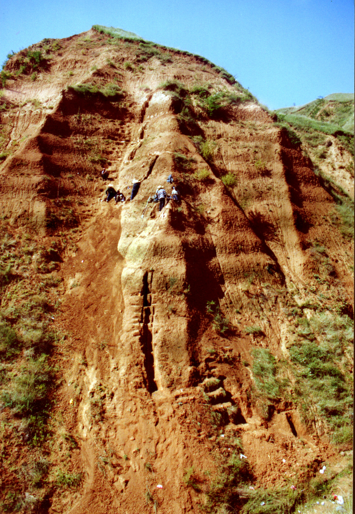 Figure 1. This is a photo showing that Chinese geologists are collecting palaeomagnetic samples and stone aretefacts in a very steep section at Shangchen, a newly found palaeolithic locality in the Chinese Loess Plateau. What an amazing landscape and dangerous scientific work! In the photo, the red layers are palaeosols, indicating warm-wet interglacial periods, and the yellow-white layers are aeolian loess, indicating arid-cold glacial periods. These loess-palaeosol cycles are not only comparable with the glacial-interglacial cycles revealed by marine oxygen isotope stages, but also they can be observed by everyone. (photographed by Zhaoyu Zhu in 2008, at Shangchen, Lantian County, Shaanxi Province, North China).